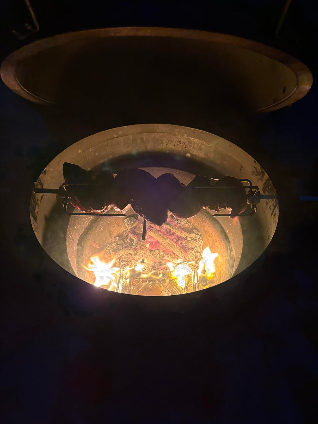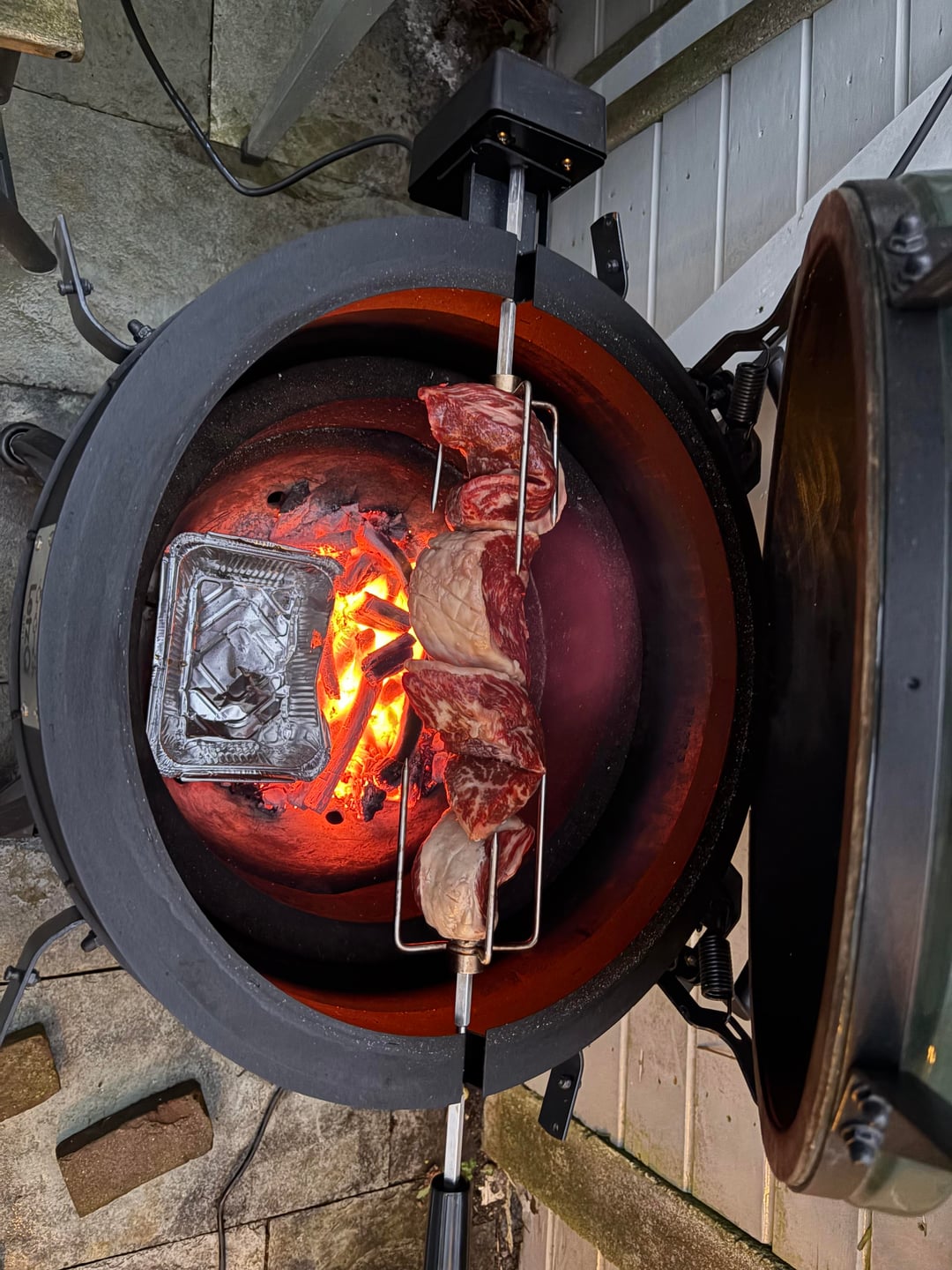 On Good Friday, I took the meat out about 2 hours before the cook. I think sufficient time to confess its sins. And sufficient time for me to fire up the BGE up to about 220C and setting up my rotisserie. Once the Picanha had made its peace, I was ready to go. I skewered the Picanha and sent it to the fiery depths of my BGE.