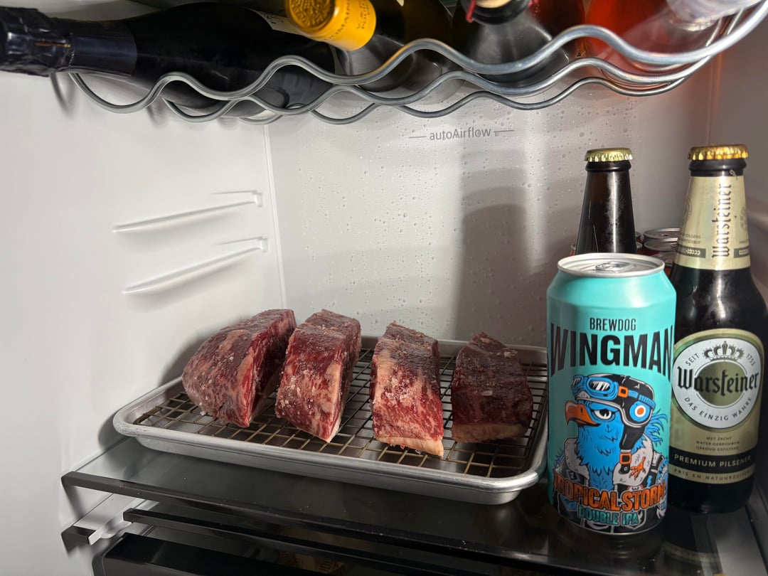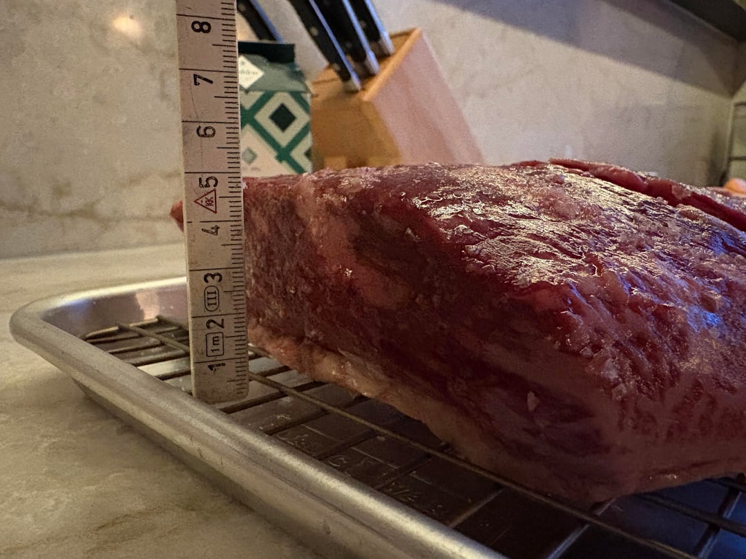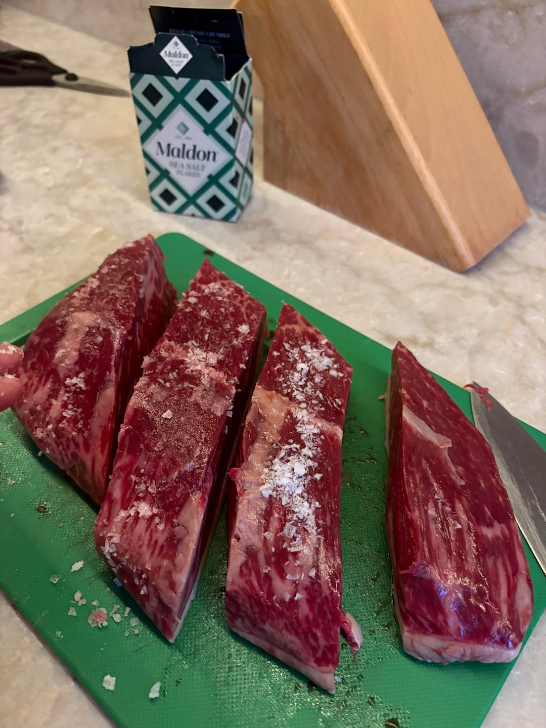 So, I did a dry brine for about 30 hours, making sure to rub the salt nice and good. I cut it up into four steaks and I carved the salt cap to ensure that the salt got good up in there, not unlike the effect a crown of thorns would have. Then I left the meat uncovered in my fridge.