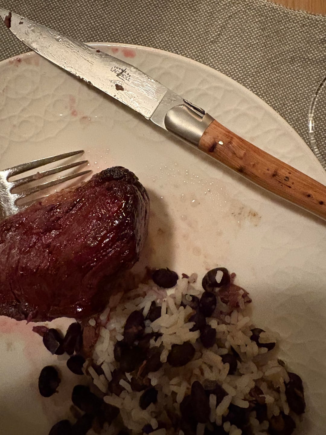 Our lord and saviour took three days to rise from his tomb. My Picanha got only about ten minutes rest. Lo and behold, he was served with a feijhão which had stewed for about 4 hours and a very nice glass of the blood of Christ; a Cabernet Sauvignon.