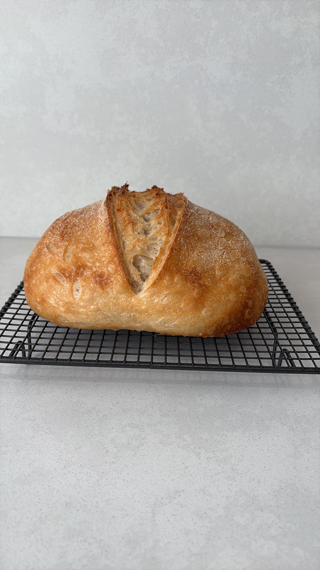 BF for a total of approx 6.5 hours. Shaped and in the fridge for about 15 hours. Baked in Dutch oven with the lid on at 230c for 35 mins then another approx 20-25mins uncovered until internal temp was 100c.
