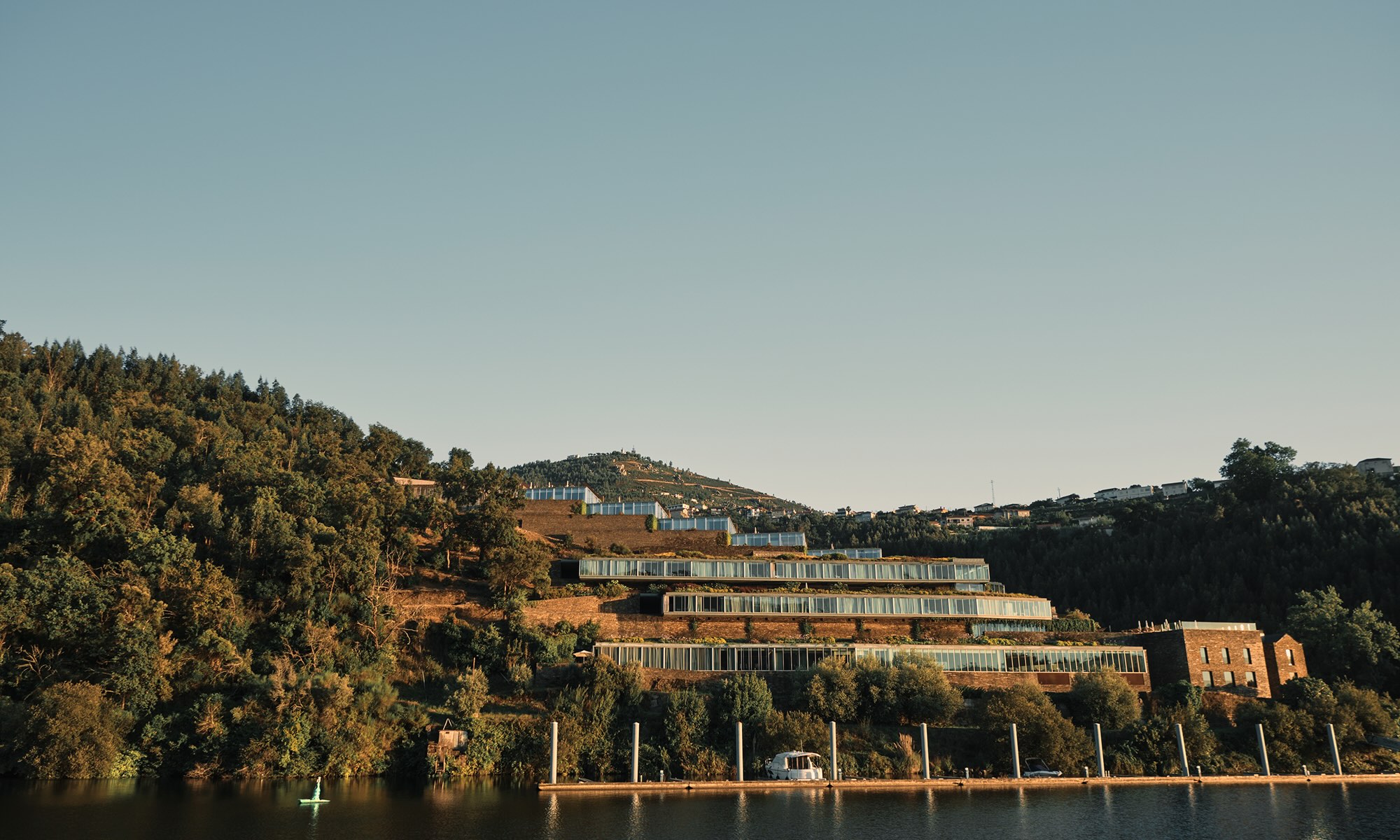 Standout features: The House Collection is built around the luxury of autonomy. Each unit is oriented toward the river, with full-height windows that frame the vineyards like living canvases. To navigate the property’s vertical layout, a modern inclined elevator (or funicular) connects the hilltop suites with the riverfront below. Jorge de Carvalho softened the original architecture by introducing a palette of local schist—the dark, flaky, metamorphic stone that forms the region’s famous wine terraces—alongside corten steel and warm wood tones. The materials were curated specifically to catch and ground the valley’s famously shifting light.