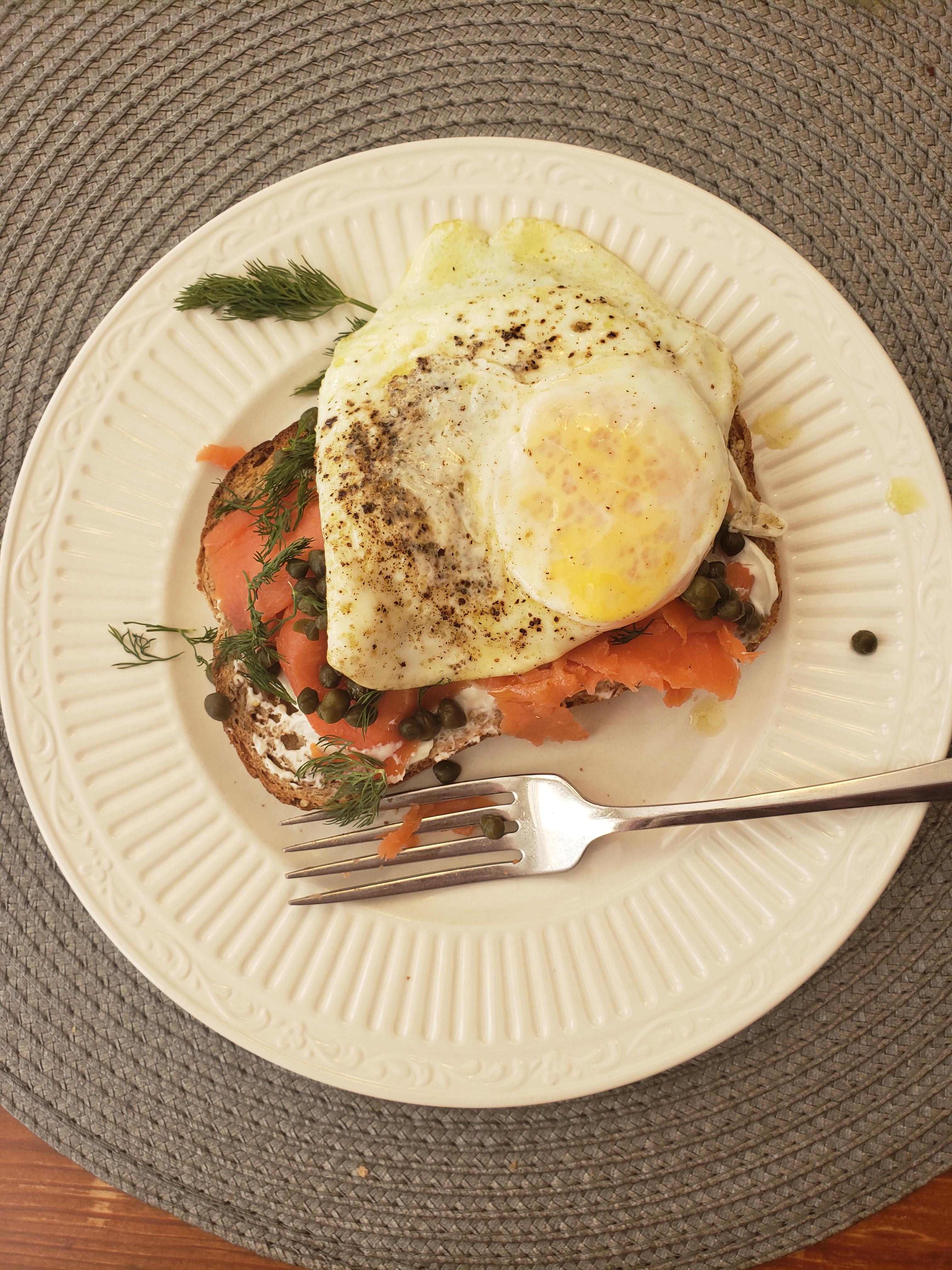 Whole grain toast with cream cheese, smoked salmon, olive-oil poached egg, capers and fresh dill. So delicious. 💜Usually I would make a salad to go with this but I'm really tired today from a terrible migraine yesterday. by _gooder Dining and Cooking