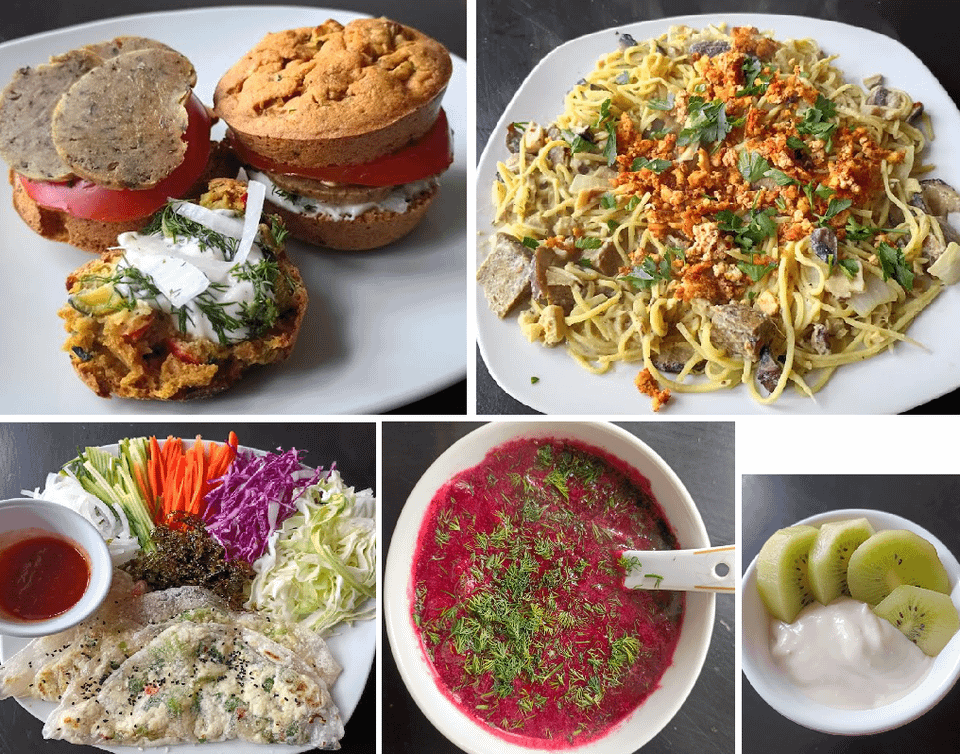 I made little sandwiches with mini chickpea frittatas and slices of a homemade seitan log A big lunch of heart of palm noodles with a creamy mushroom sauce and crunchy tofu bits on top. Borchst and a fun meal inspired from hubbybap on ig for dinner. Fry rice paper stuffed with tofu and then use it as a wrap for a handful of veggies and seaweed. Little snack of kitehill Greek yogurt and kiwi.