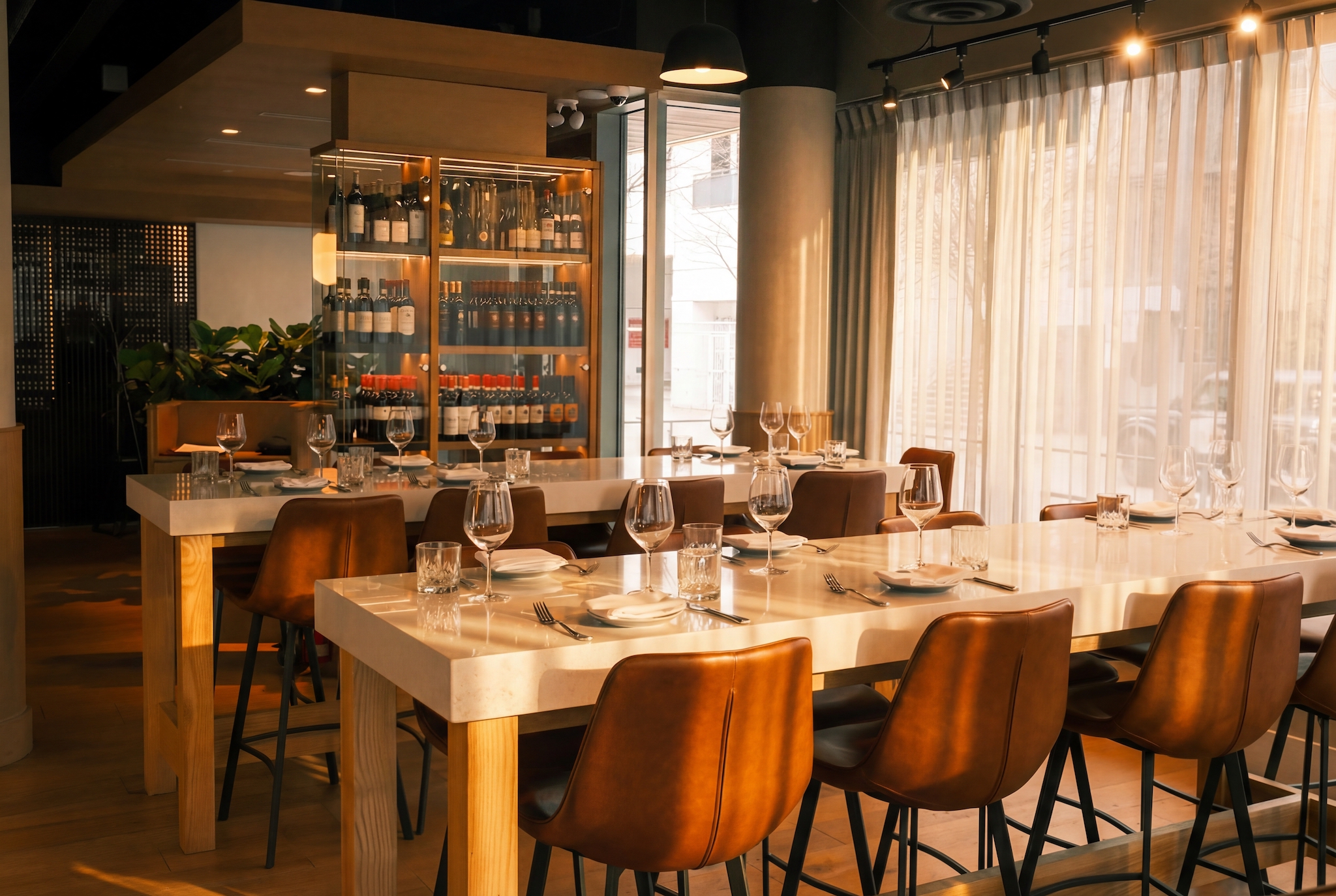 It features an open kitchen that keeps the energy buzzing, while a warm fireplace adds cozy vibes and racks of wines add to the European ambience.