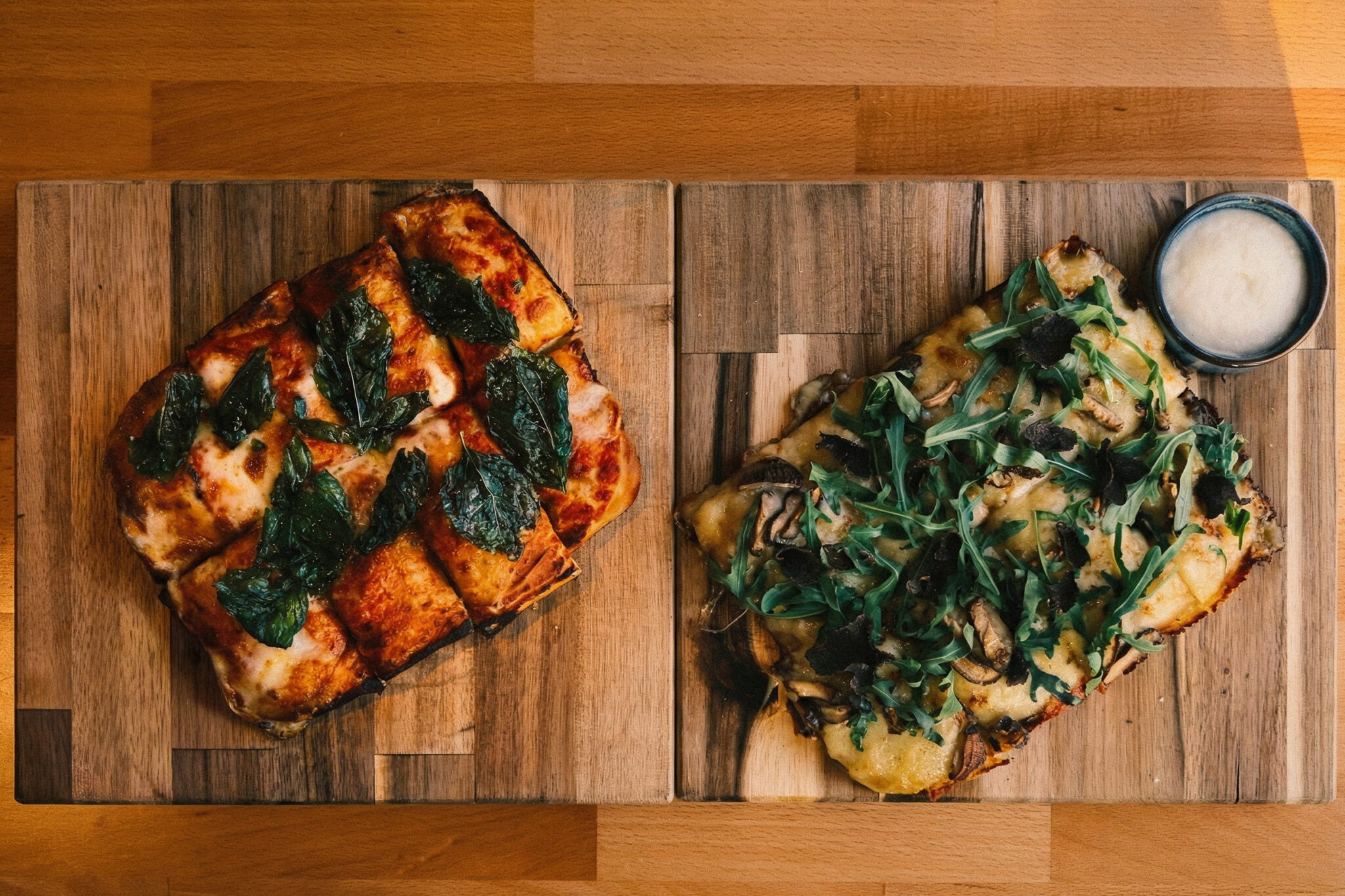 Of course, the star of the show is the Roman-style pizza al taglio. Baked in large rectangular trays and cut into perfect squares, every slice delivers a playful contrast: a light, airy texture and a slightly chewy, satisfyingly crisp base.
