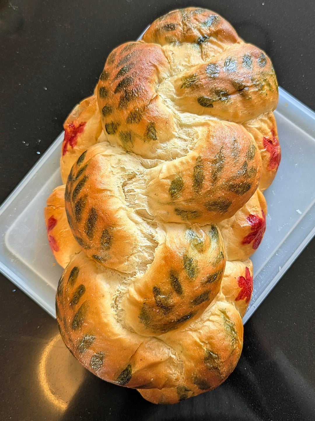 Instead of painting eggs, we did some Easter bread painting instead! I read that adding white coloring would make the colors pop more, but I didn't have any. Tented this half way baking so the colors still came through.
