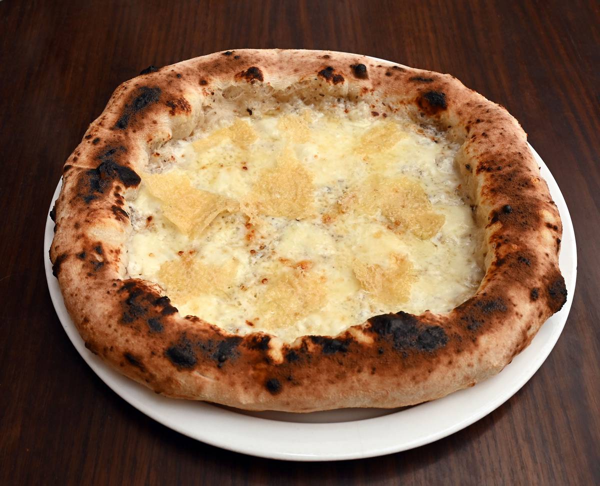 A decadent pizza featuring black truffle cream, three cheeses, and pecorino crisps, allowing the truffle to shine. It’s a cheese lover’s delight.