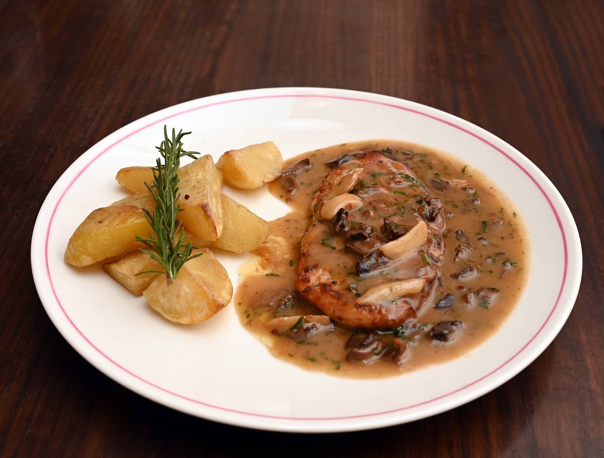 Grilled chicken with porcini mushrooms and rosemary potatoes, reflecting a hearty, protein-forward addition to the menu. The mushrooms add an umami touch to the dish, enhancing the flavours of the chicken.