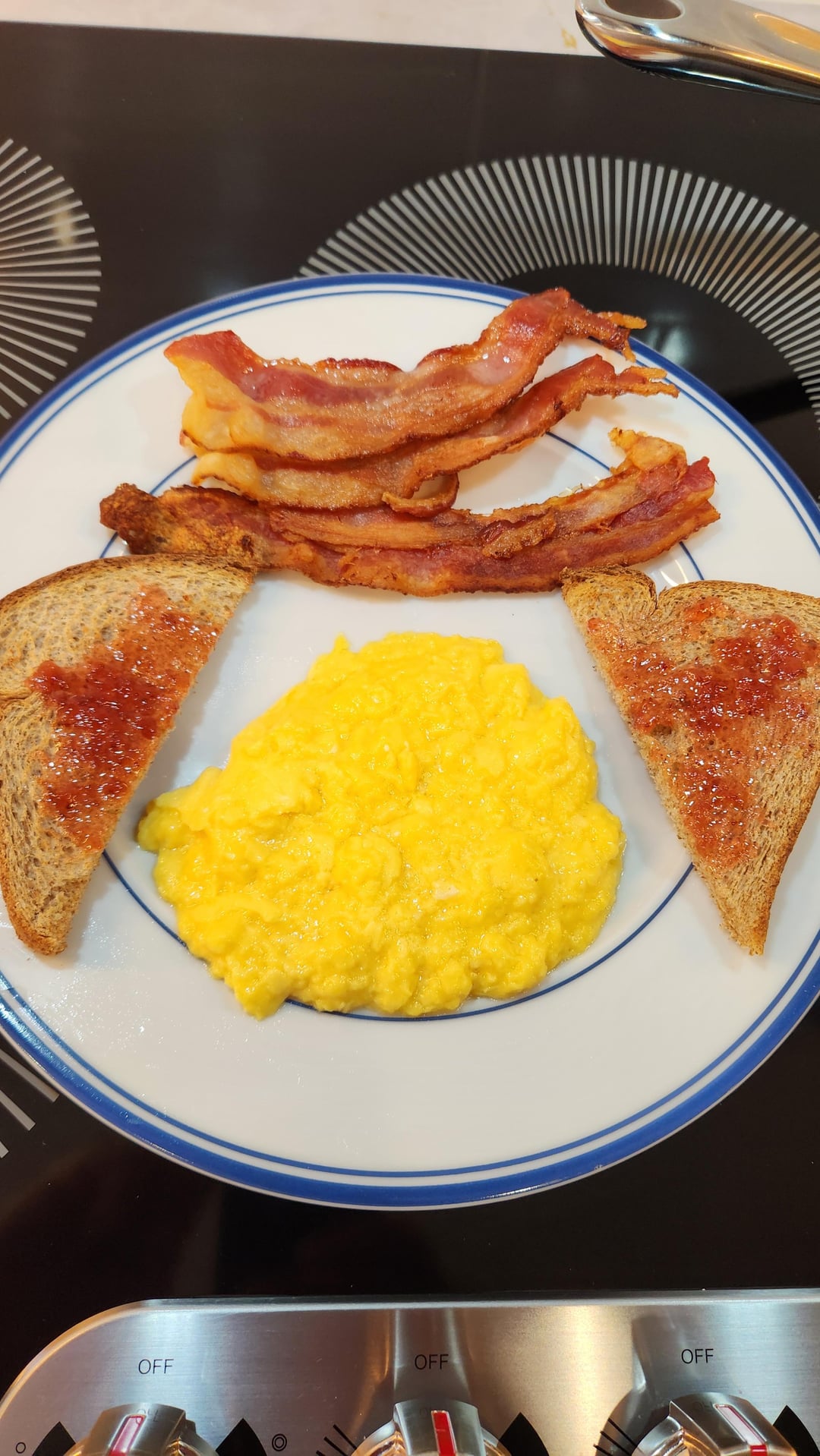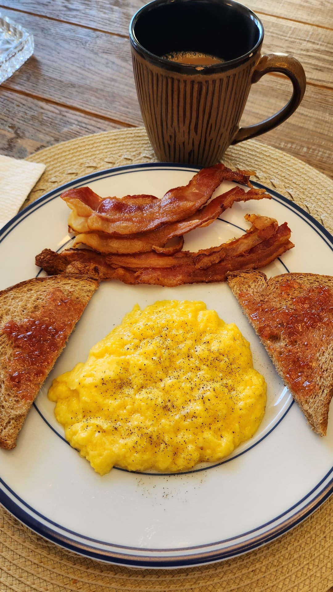 Crispy bacon, soft scrambled eggs, wheat toast with strawberry preserves and coffee.by GuavaOdd1975 Dining and Cooking