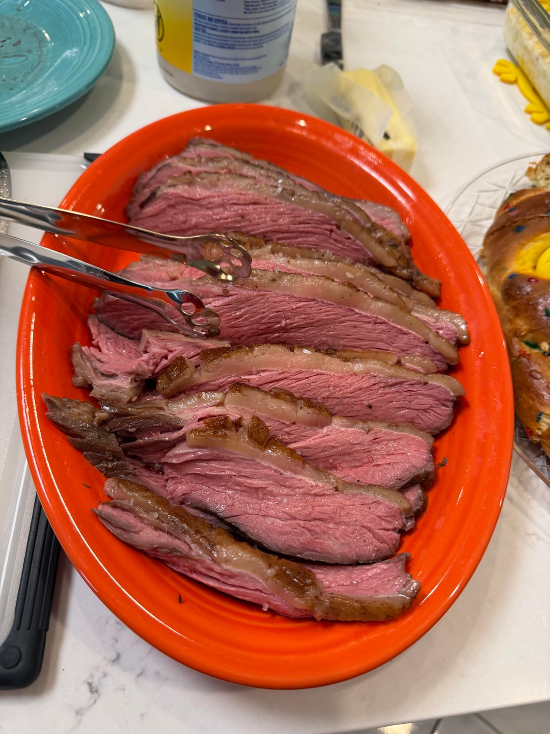 It’s cut with the grain to be cut into steaks so that the final serving cut is against the grain. Looks delicious but that cut direction hurts my eyes and soul.