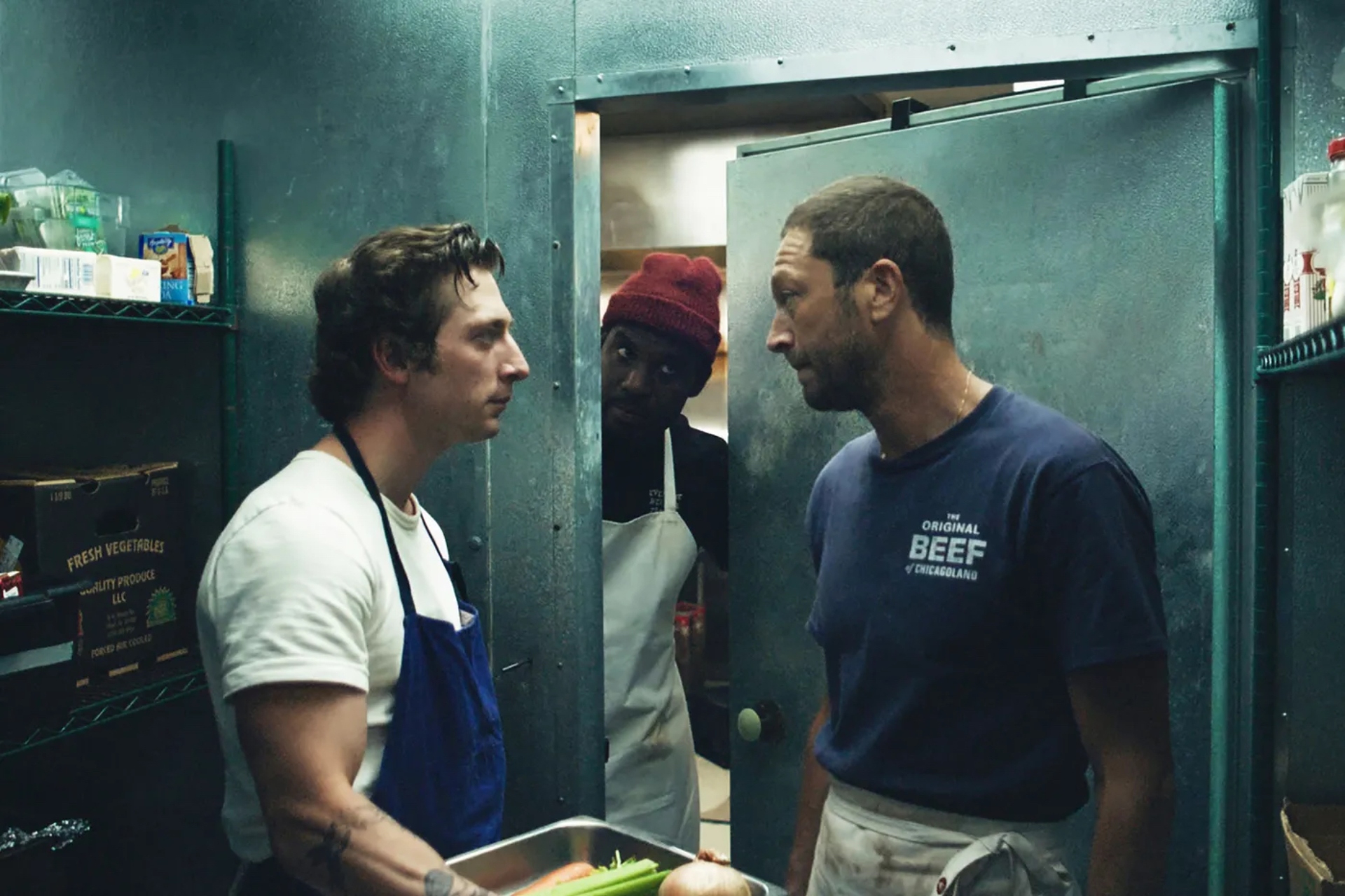 Jeremy Allen White’s character Carmy (left) with Ebon Moss-Bachrach’s character Richie (right) and Marcus, played by Lionel Boyce (middle), in a scene from “The Bear,” set in a fictional Chicago Italian beef stand. Credit: Instagram