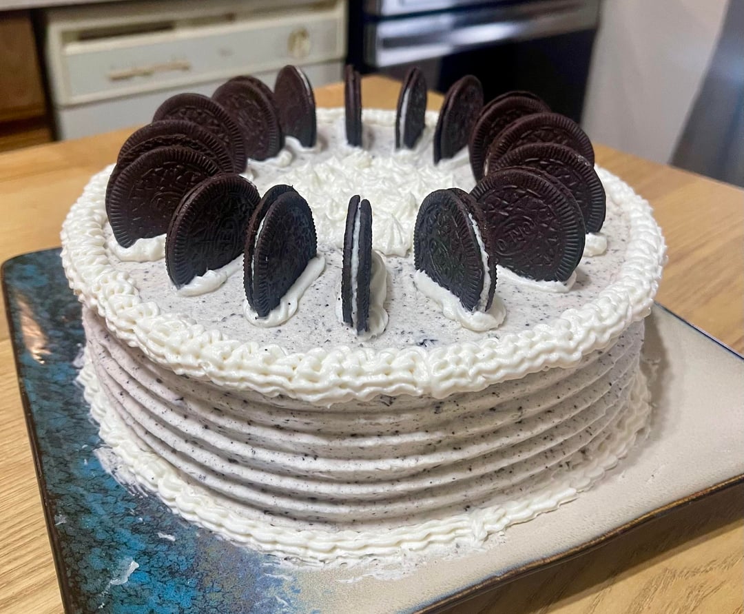 Here is my second attempt at a layer cake. It’s a 3 layer chocolate cake (thanks to everyone who helped me earlier with suggestions to replace the cocoa powder I was short – I ended up using melted chocolate chips) with a from scratch Oreo buttercream. I think my decorating is getting better, and will hopefully continue to do so. My son just ate a piece in about 30 seconds so I’d say it tastes good!
