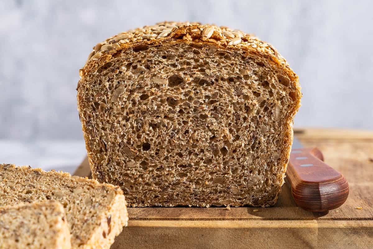 Egg wash: brushing the top of the loaf with an egg wash helps the mixed seed topping stick to the bread and creates a golden-brown crust. To make it vegan, use Just Egg (vegan egg replacement) thinned with some plant-based milk, or to use aquafaba.