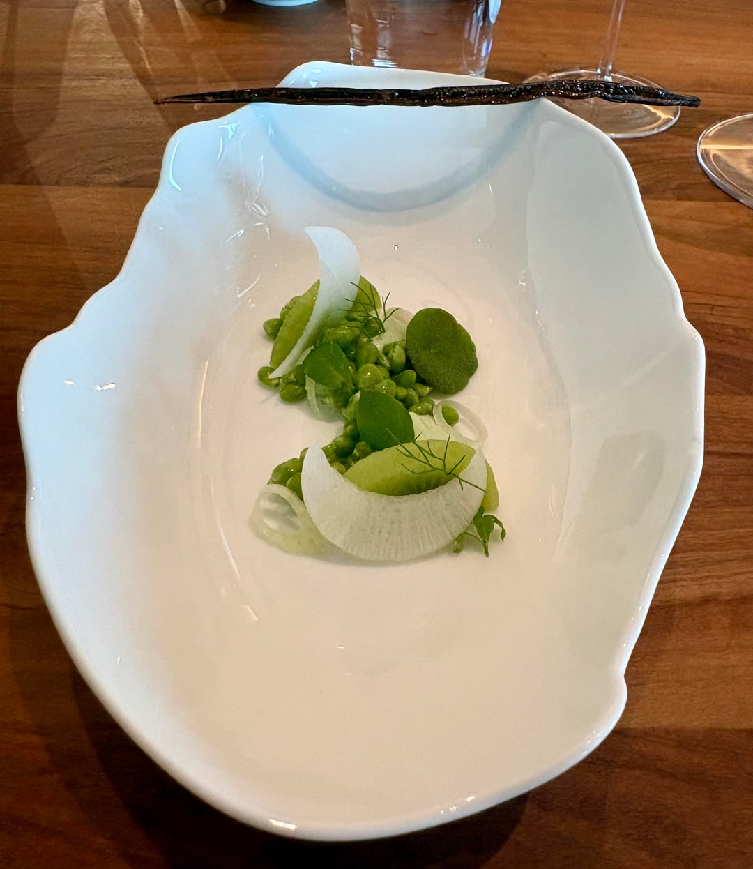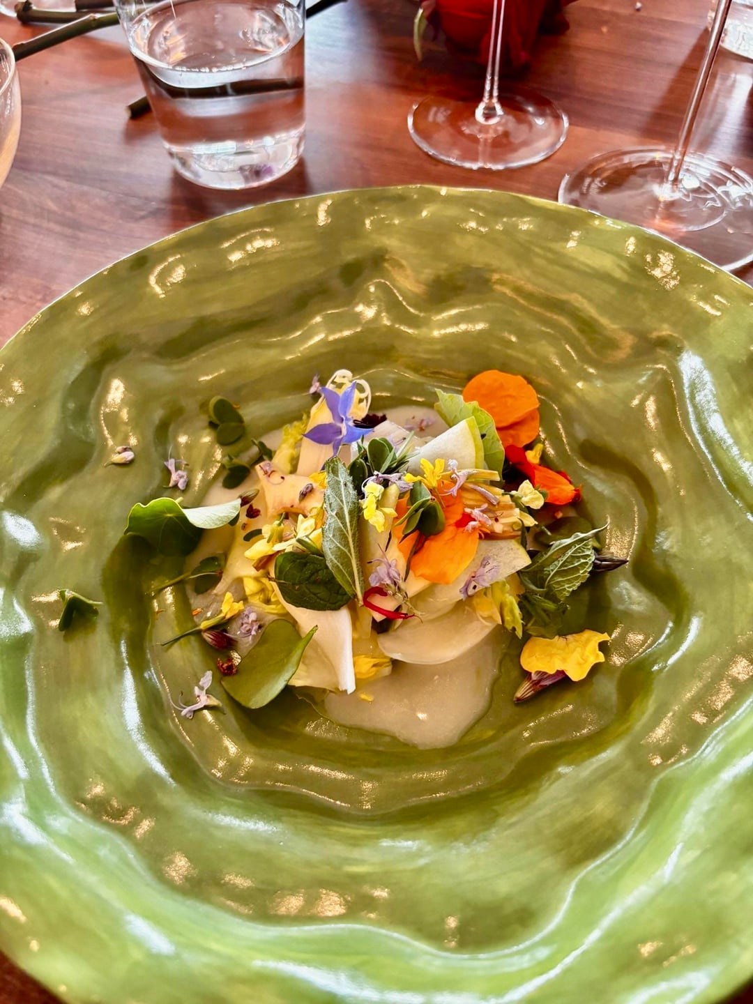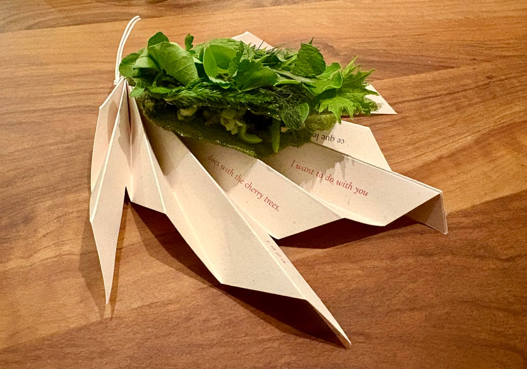 • **Asparagus salad** (green apple, artichoke?, fennel?, flowers) — great, every bite tasted different