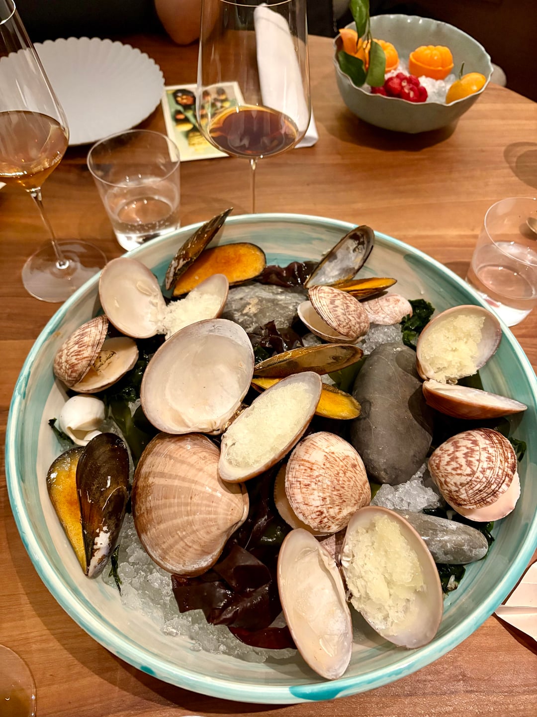 • **Sorbet coquillage** (citrus sorbets & granitas in mussel shells + mandarin with sake + forest strawberries) — fantastic