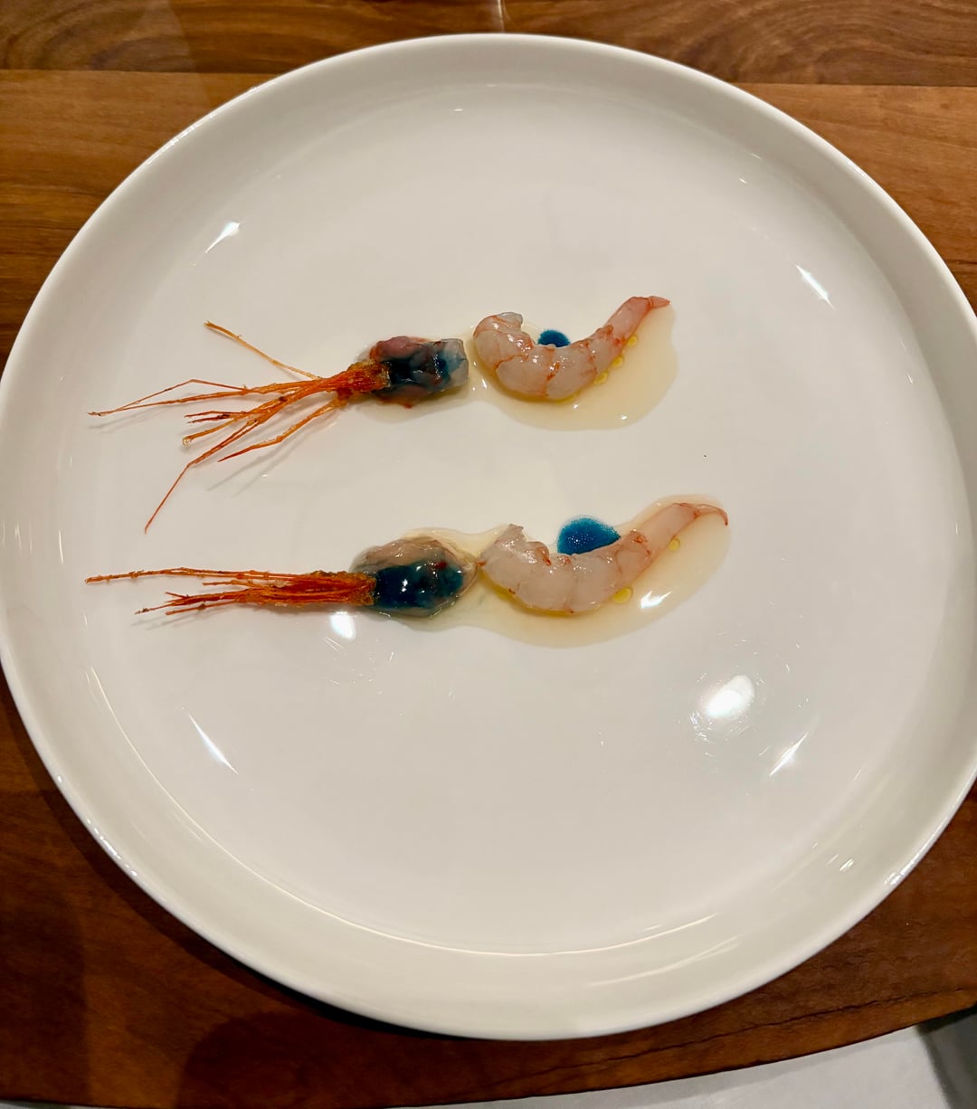 • **Quisquillas** (blue shrimp: fried head, raw brain + eggs, body) — eat one combined and one in parts; great texture differences and quite sweet