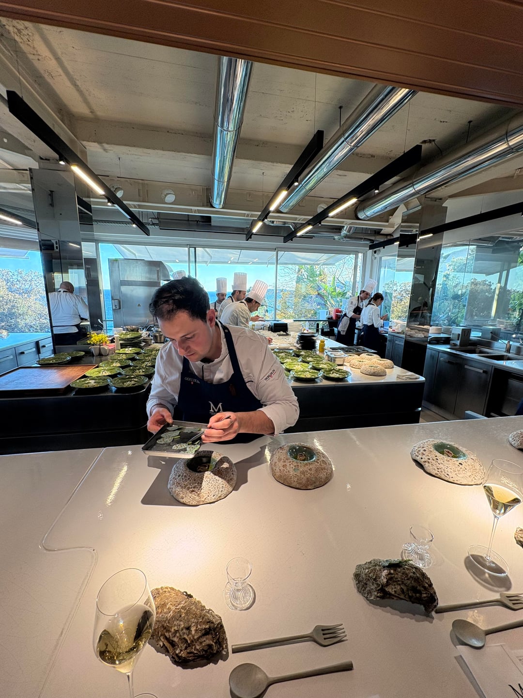 Served at the kitchen counter with a view of the sea. Chef Mauro came to greet us and accompanied this act.