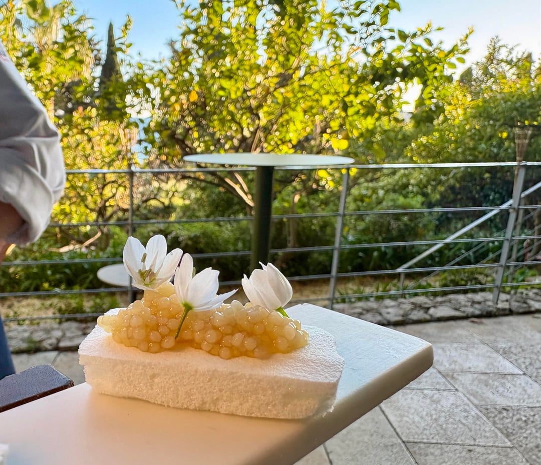 • **White caviar, savoury meringue, garlic flowers** — excellent