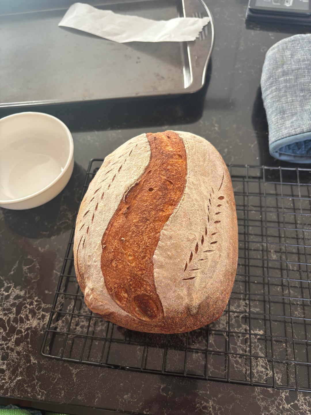For the open baking I used a cookie tray to cook my dough on. And for the steam I used a cast iron. I wanted to try the ice method for the steam and I think that’s where it went a little wrong. I preheated my oven for 30 mins before I put the dough in and about 7 ice cubes. I feel like my steam escaped quickly because of the ice and maneuvering to place the cast iron in the bottom and then close the door.