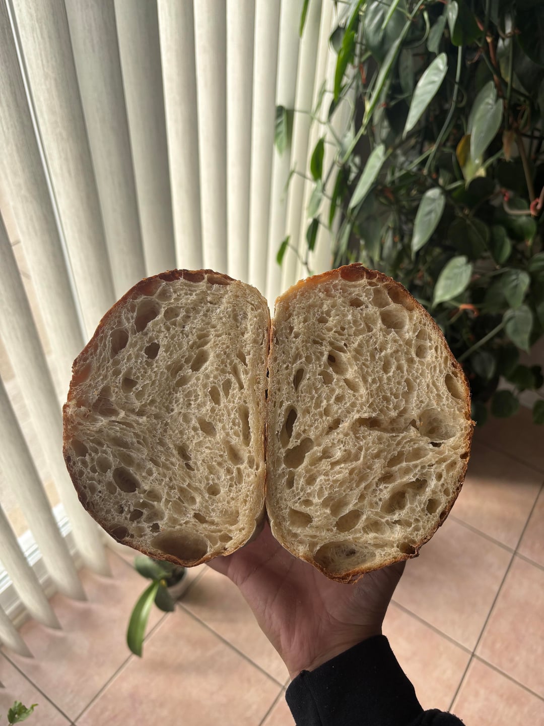 I mixed the dough and let it rest for 1 hr. Then performed 2 sets of stretch and folds every 30 mins. Switch to 2 sets of coil and folds every 30 mins and then let my dough ferment. Total process maybe around 6 hr bulk fermentation at 75-78°f. At the 5.5 hr mark I pre shaped the dough to let rest for 30 mins before final shaping.