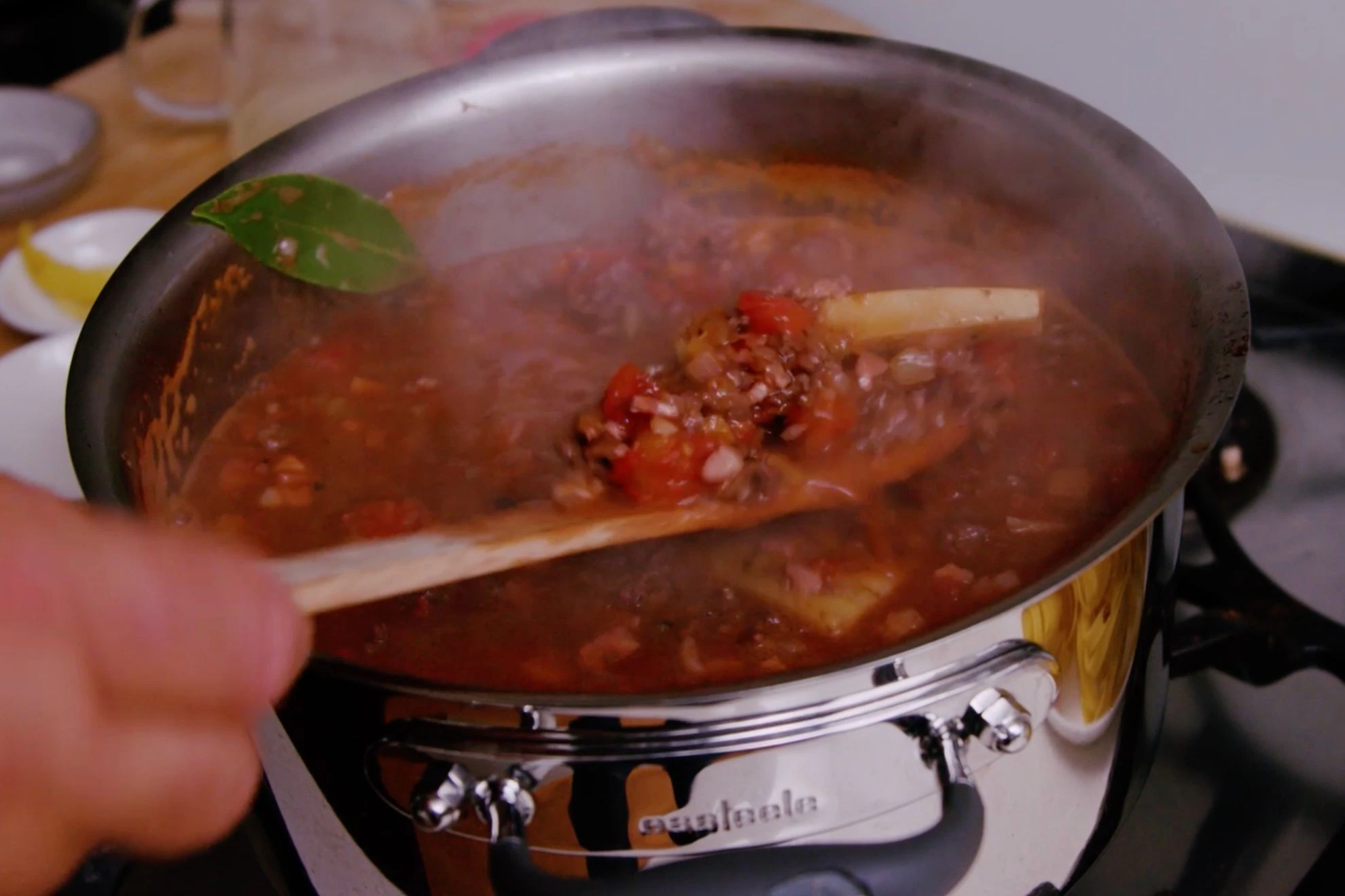 Step 3: Increase heat to high. Add some red wine to the pot and simmer until reduced by half. Return mince mixture to pot. Add some diced tomato and beef stock. Bring to the boil, then reduce the heat to very low. Add a 6cm piece of parmesan rind (Matt uses up to 3 of these!), Worcestershire, bay leaves, lemon rind and some lemon juice. Season well with salt. Cook, covered, stirring occasionally, for 4 hours or until the sauce is a glossy dark red. Season with salt and more lemon juice.