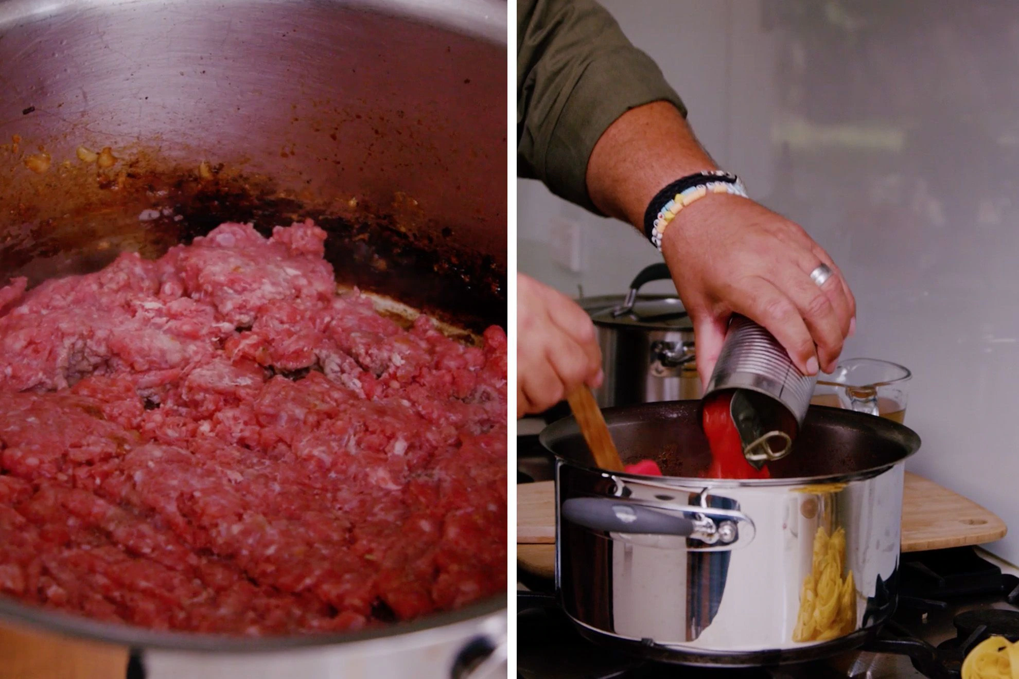 Something you often throw away, parmesan rind, is the secret ingredient in Matt’s bolognese and key to this recipe. It gives us “a lovely little extra bit of flavour,” Matt says.