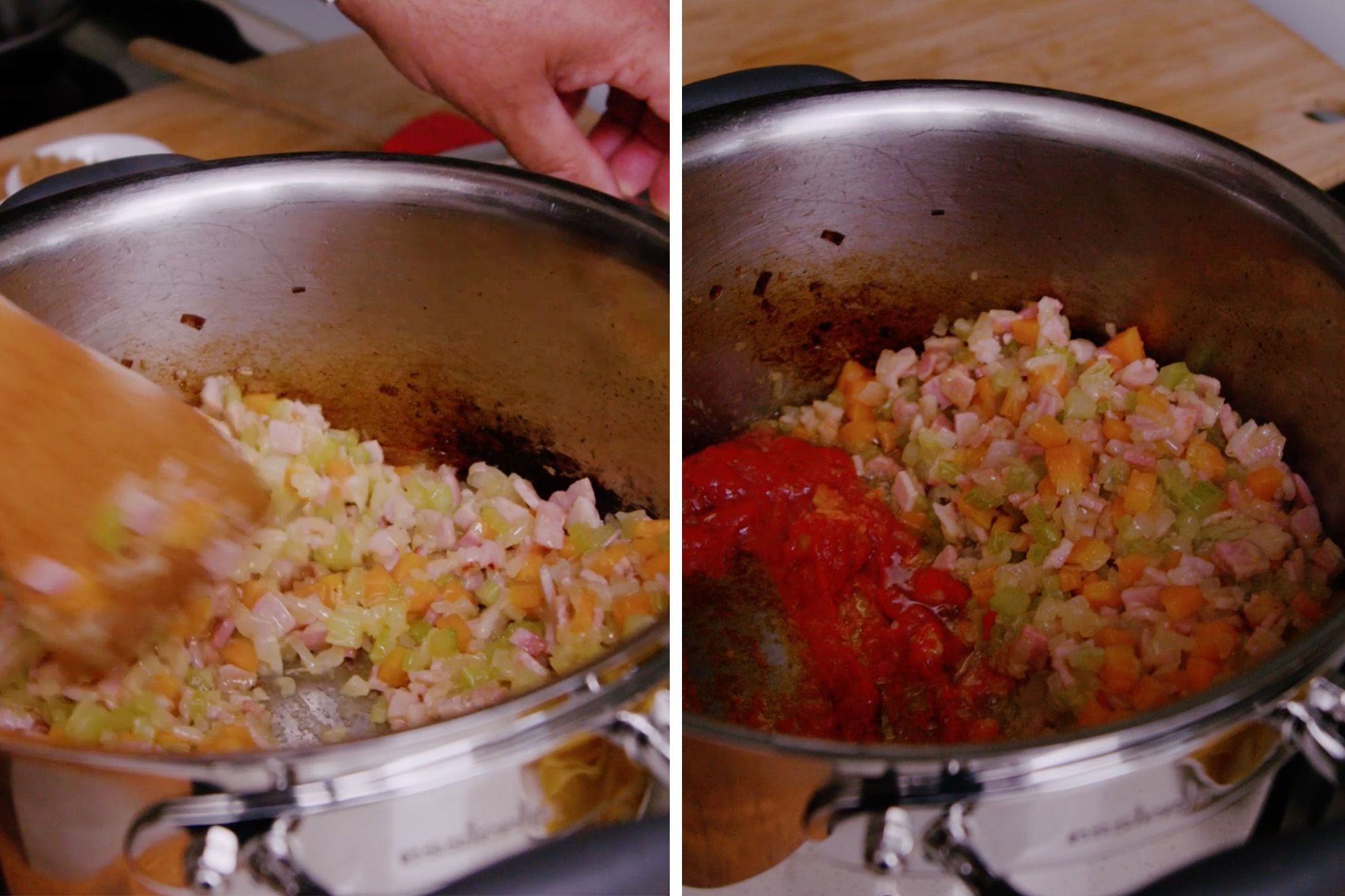 Step 1: Heat some butter and olive oil in a stock pot over medium-high heat. Add chopped bacon, onion, carrot and celery, and cook, stirring occasionally, for until the vegetables are soft and translucent. Add some crushed garlic and cook, stirring, for 30 seconds or until aromatic. Add some tomato paste and brown sugar. Cook, stirring, for a few minutes, then transfer to a large heatproof bowl.
