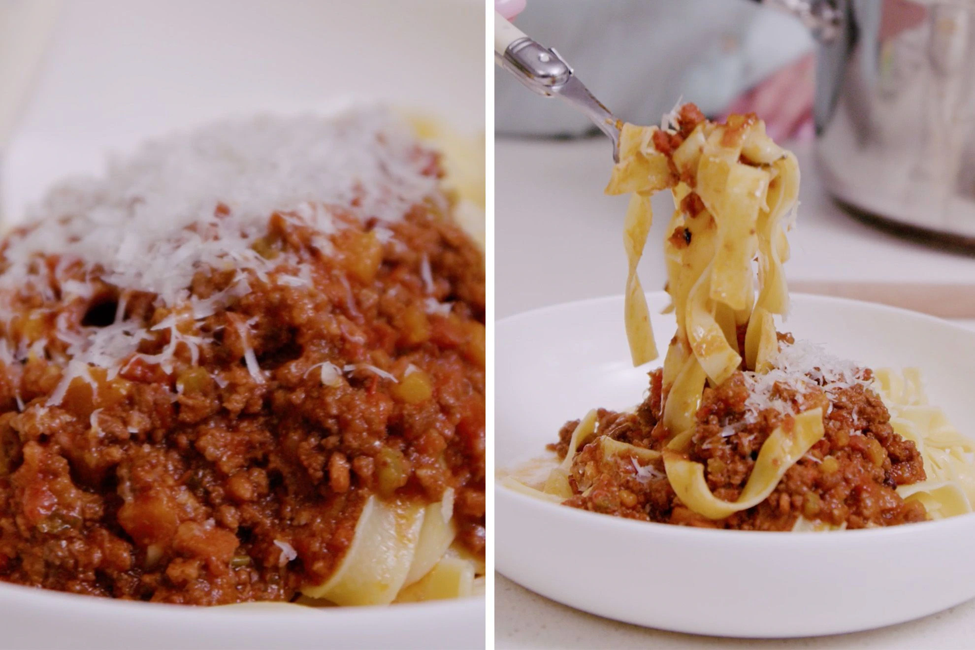 And the result? It’s rich, it’s creamy, it’s meaty…” says Matt. “So, that’s my bolognese with my secret ingredient: those parmesan rinds you might otherwise throw away. Do not throw away your parmesan rinds; save them for any time you make a bolognese.”