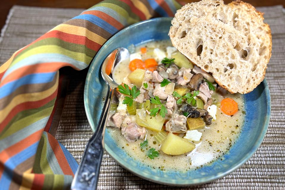 Serve this hearty chicken and vegetable stew for lunch or dinner with your favorite side dishes. We like a warm piece of sourdough bread on the side.