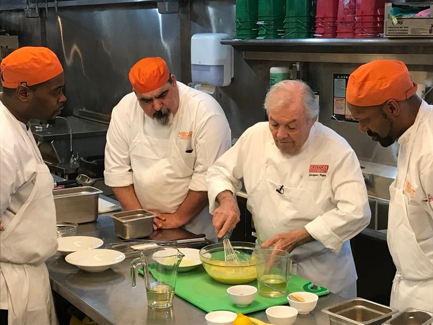 Pépin with students at New England Culinary Arts Training (Photo by Ken Goodman, courtesy of Middle Name Communications)