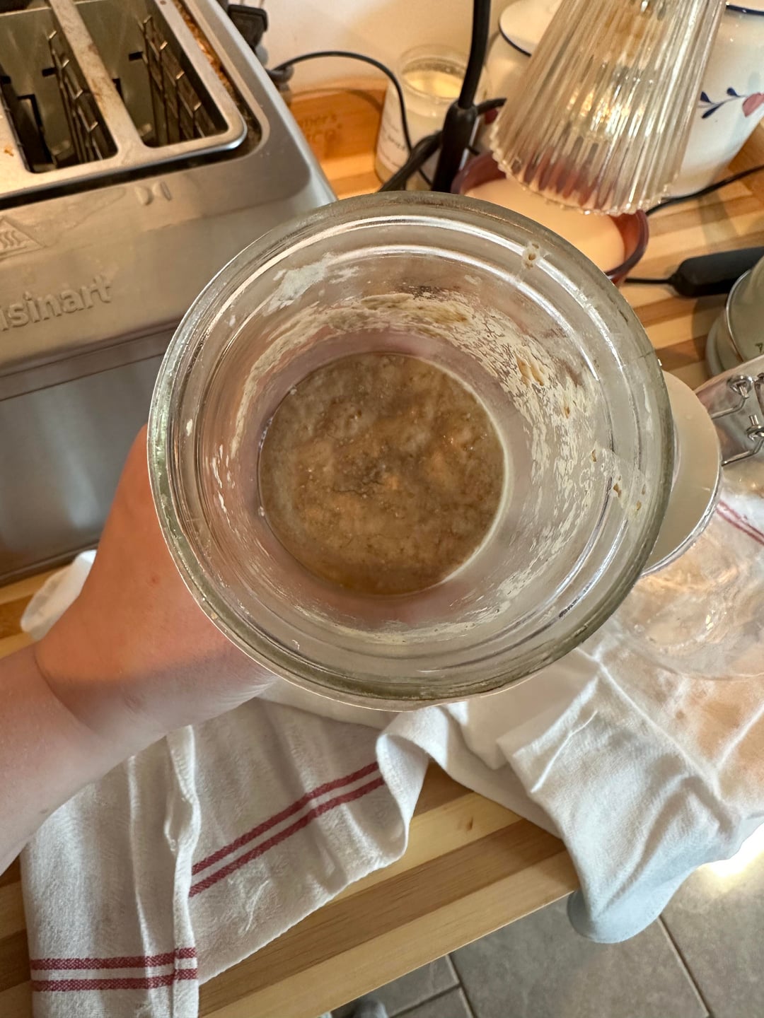 After acquiring a better jar, I poured off the hooch (sorry to all the hooch purists who wanted me to stir it back in). I then scraped off the top layer (picture 2). I couldn’t see any mould or anything particularly concerning. I measured out 50g starter, 50g bread flour, and 50g water. Mixed that shit, put the lid back on very loosely, and sat her carefully in the pantry.
