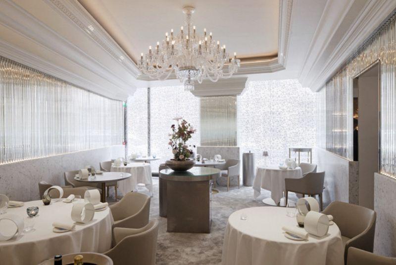 The Great Hall dining room of Kei features mirrored walls lined with glass tubes, creating a crystalline play of light