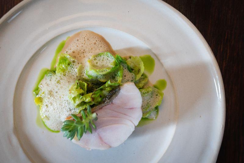 At Magma, red gurnard is served with Brussels sprouts on a bed of foie gras sauce with a garnish of stonecrop from Nice