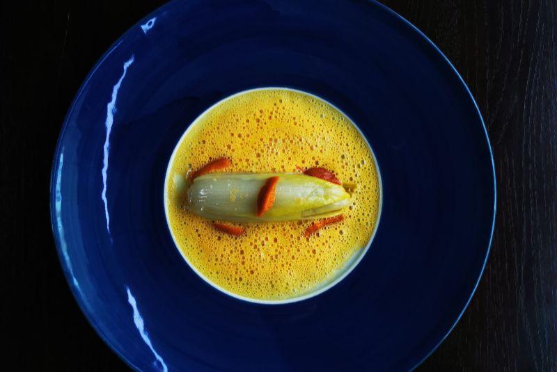Endive confit stuffed with hazelnut and citrus, topped with bright sea urchin and carrot‑juice sauce at Maison