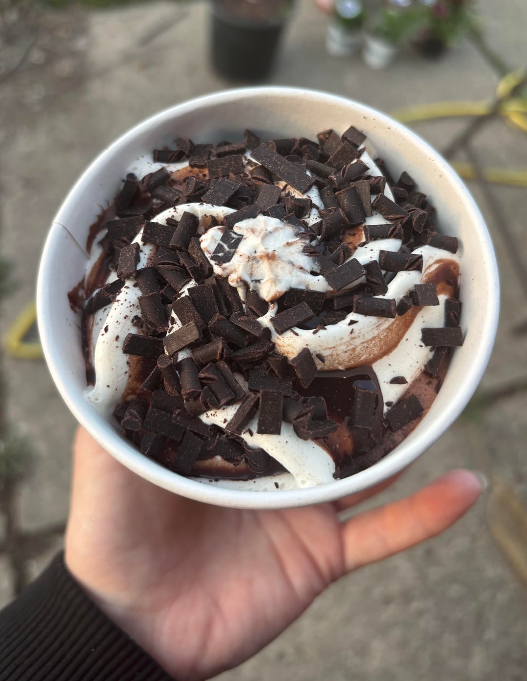 Description: Chocolate cold brew ice cream with chocolate cookies & chocolate cookie swirls, topped with fudge-swirled whipped topping & fudge chips!