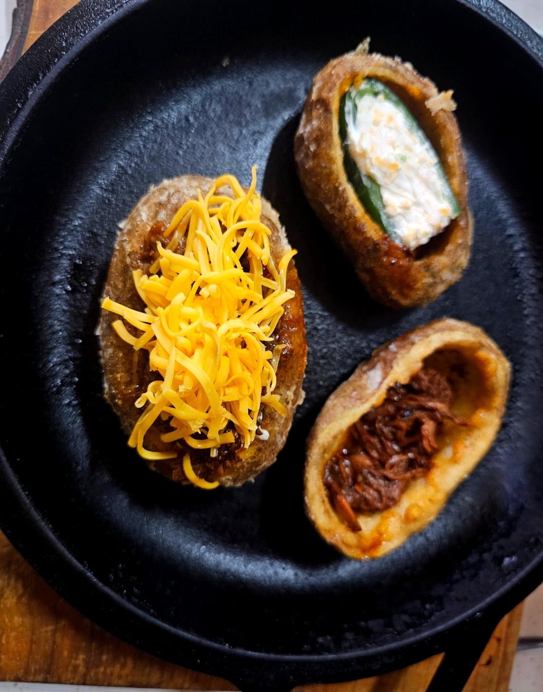 The popper filling is cream cheese & cheddar, birria on bottom, popper, more birria, cheddar, and into the oven until the cheese melts, then top w/ crispy onions & enjoy! 😁