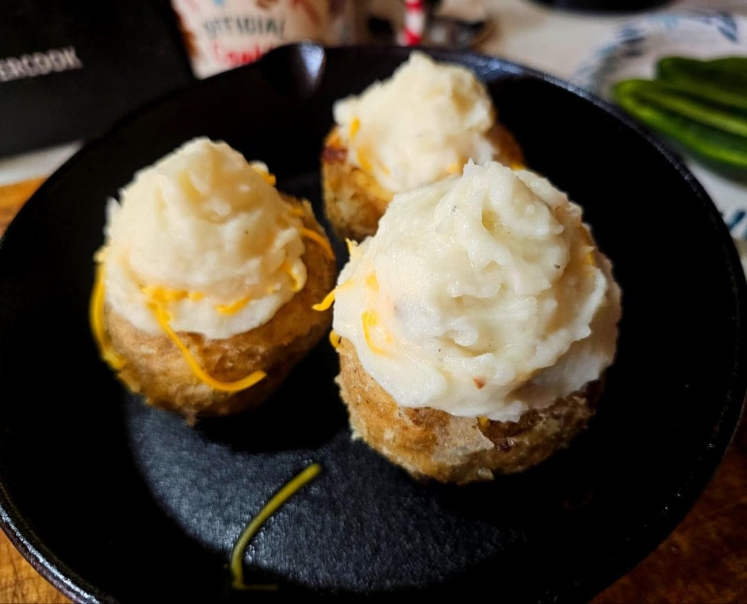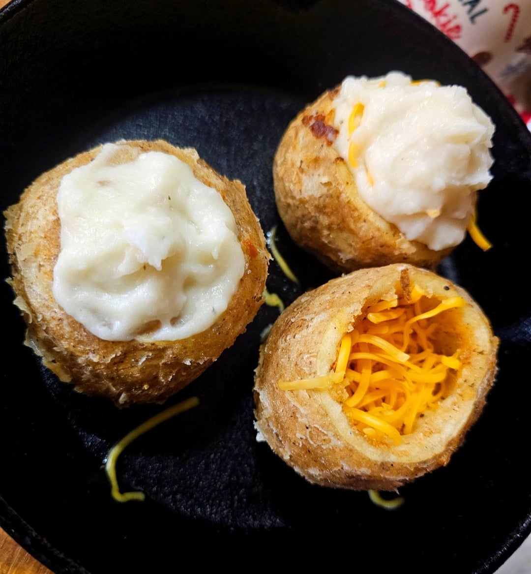 While it simmers, play some knifey spoony to hollow out some potatoes. I don't like to waste the inside so I added a few small ones to fill with mashed potatoes. Rinse the skins until the water runs clear then soak in cold water while prepping.