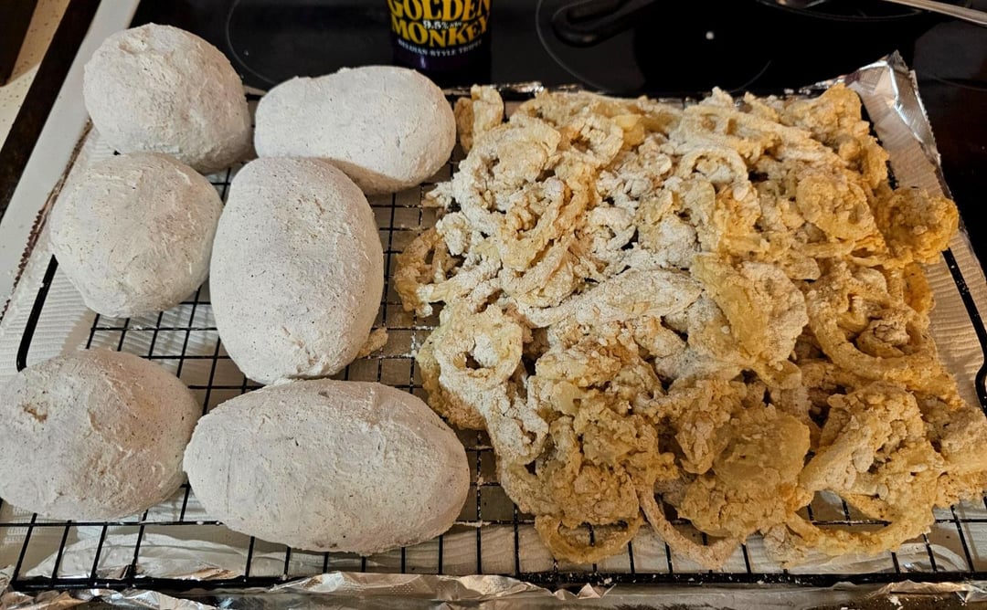 Since I was going to fry the skins and needed a crispy topping, why not onions? 😂 Slice thin then toss in a buttermilk batter w/ flour, cornmeal, SPPOG, chili powder, cumin, & tumeric.