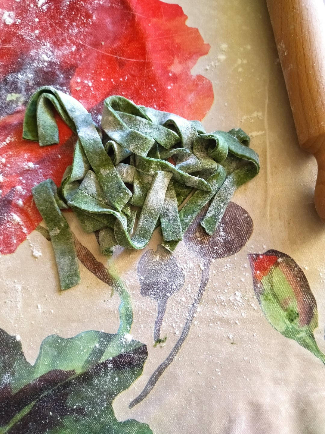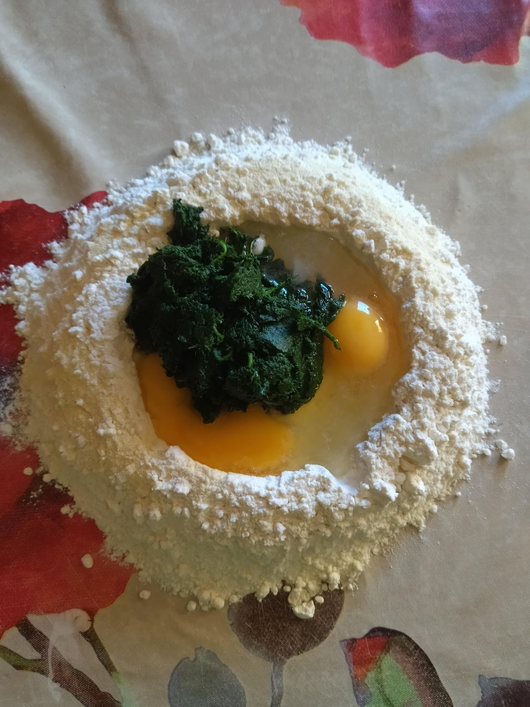 For the pasta -> 250g flour, 50g semolina, 2 eggs, about 80g spinach, a pinch of salt, and a tablespoon of oil.