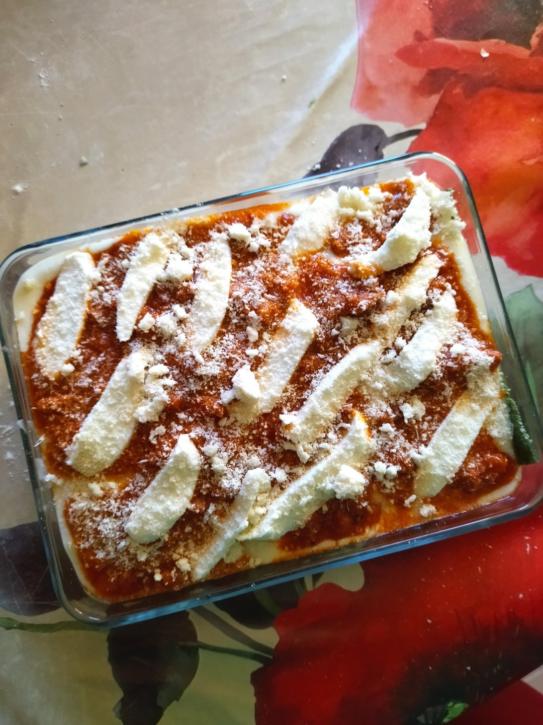Method -> I made the sauce the day before with the classic soffritto, added the meat, deglazed with wine, and once it had evaporated, added the passata and spices, and cooked for about an hour. Today I made the béchamel sauce, made a roux with the flour and butter, added the milk and nutmeg, and stirred until thickened. Then, for the pasta, I made the classic mound with the flour, added the eggs, the well-drained and blended spinach, mixed everything with a fork, and kneaded the dough by hand. Then, with a rolling pin and a lot of determination, I rolled it out as thinly as possible, cut it into rectangles, and began assembling the layers: bechamel on the base, lasagna, bechamel and sauce, mozzarella strips, and Parmesan cheese, repeating for about 6 layers. Then I baked it at 170°C (350°F) for about 40 minutes, or until golden brown; I like an almost charred crust.