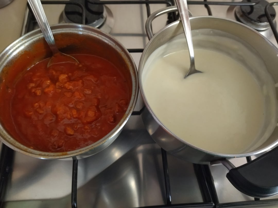 Béchamel -> 60g butter, 60g flour, and 600ml milk, salt, and nutmeg.