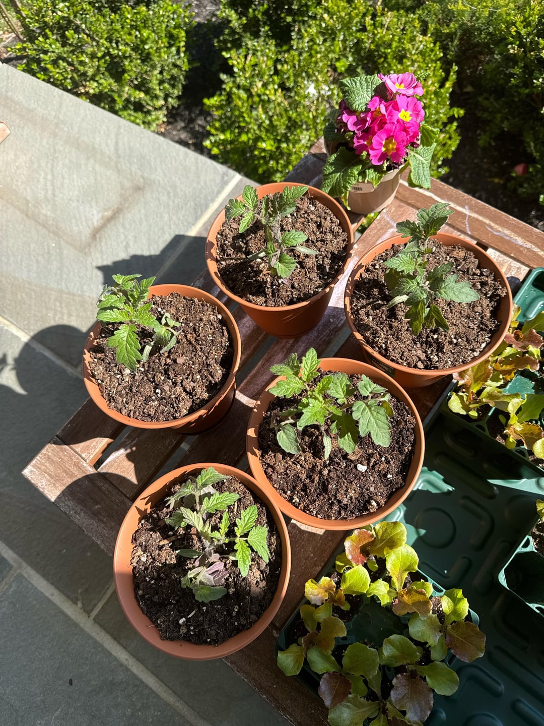 This is my first year growing vegetables, and planted more than I have space for indoors. I have 4 healthy tomato plants that are nearly 4 weeks old and growing happily under grow lamps indoors. My other 5 have been outdoors for lack of space under my two grow lamps. I didn’t really harden off properly — got a bit overwhelmed with so many seedlings (originally had 32) and kept watering but basically left them on my porch to get some sun and shade. It’s still too cold for them where I am (7b/8a in MD), but they don’t seem to be doing terribly. Some new green leaf growth from the center, although the older leaves have developed purple underneath.