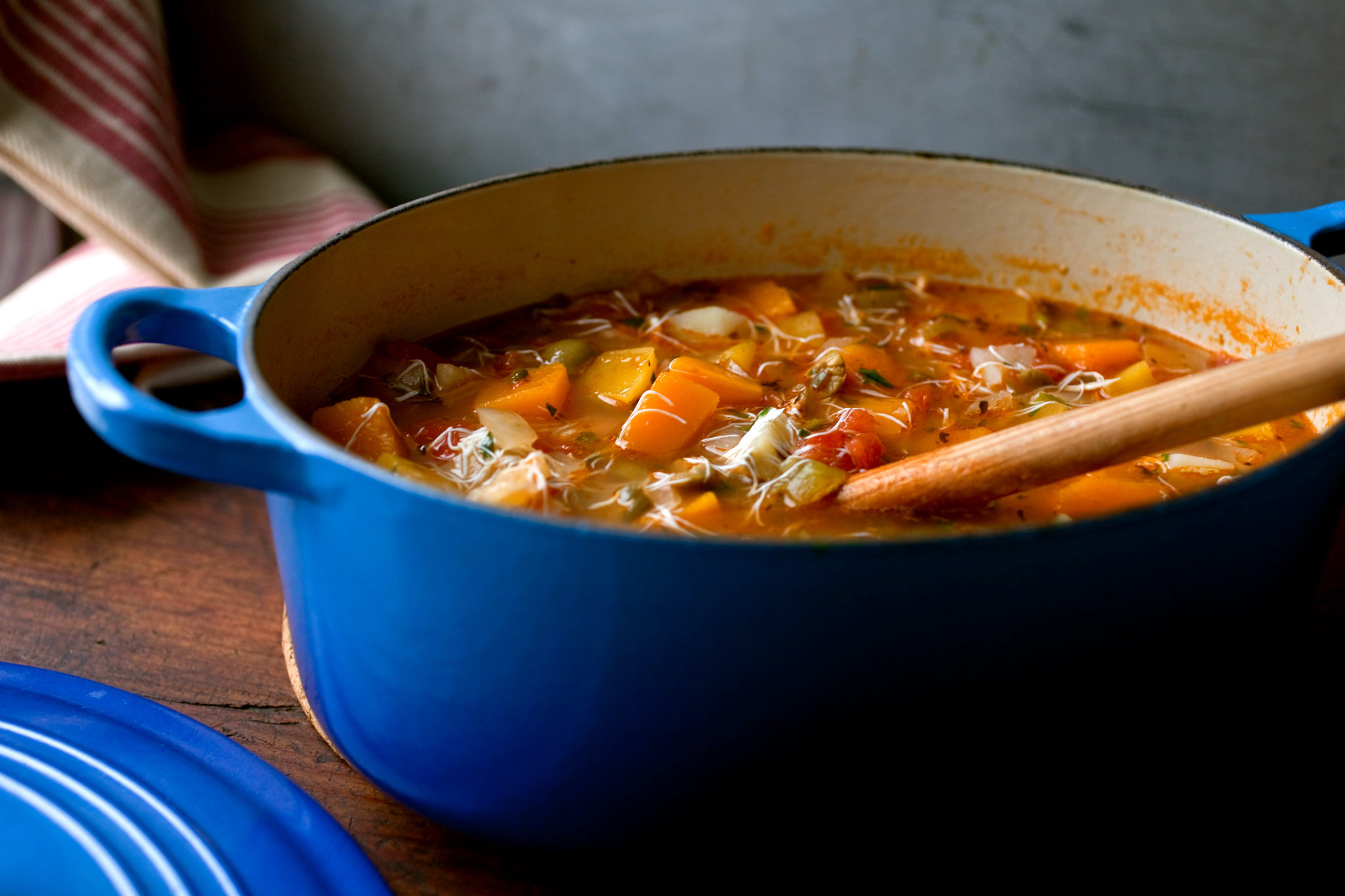 - Heat the oil over medium heat in a large, heavy soup pot or Dutch oven, and add the onions. Cook, stirring, for five to 10 minutes until tender. Add the garlic and continue to cook for another minute or two, until the garlic begins to color. Add the tomatoes and about 1/2 teaspoon salt, and cook, stirring, for about 15 minutes, until the tomatoes are somewhat cooked down and the mixture smells fragrant. Add the potatoes, the winter squash, chiles, olives, capers, bouquet garni and the oregano, and stir together for five minutes. Add 2 quarts water and salt to taste, and bring to a simmer. Simmer 30 minutes, until the potatoes and winter squash are tender. Taste and adjust seasonings, adding more salt and/or garlic if you wish. Remove from the heat if not serving right away.