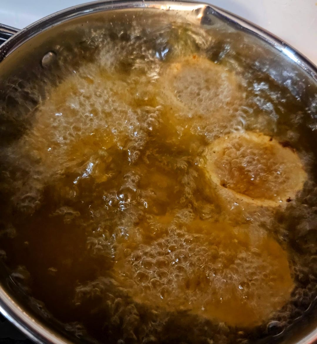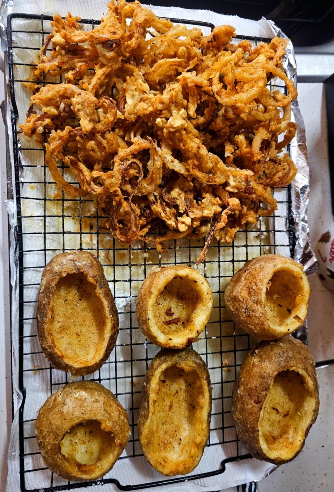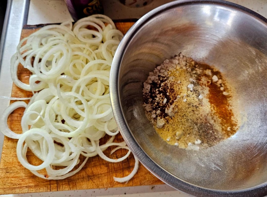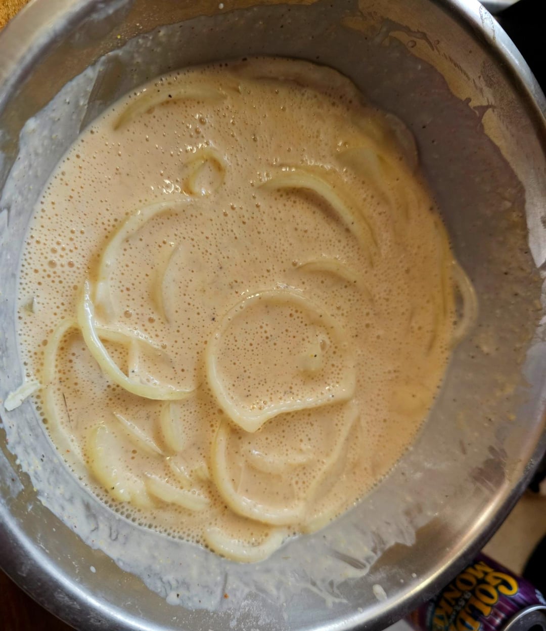 Since I was going to fry the skins and needed a crispy topping, why not onions? 😂 Slice thin then toss in a buttermilk batter w/ flour, cornmeal, SPPOG, chili powder, cumin, & tumeric.
