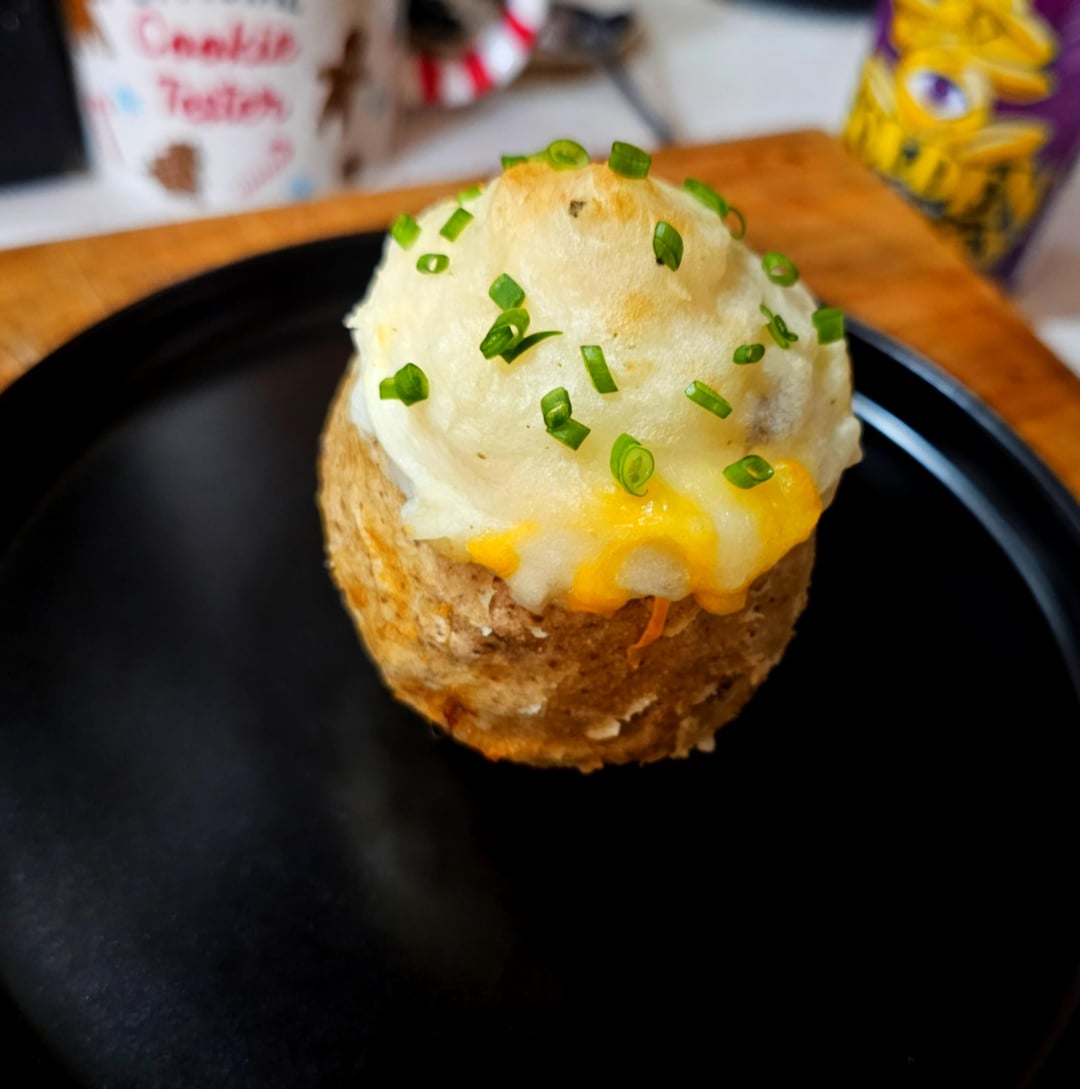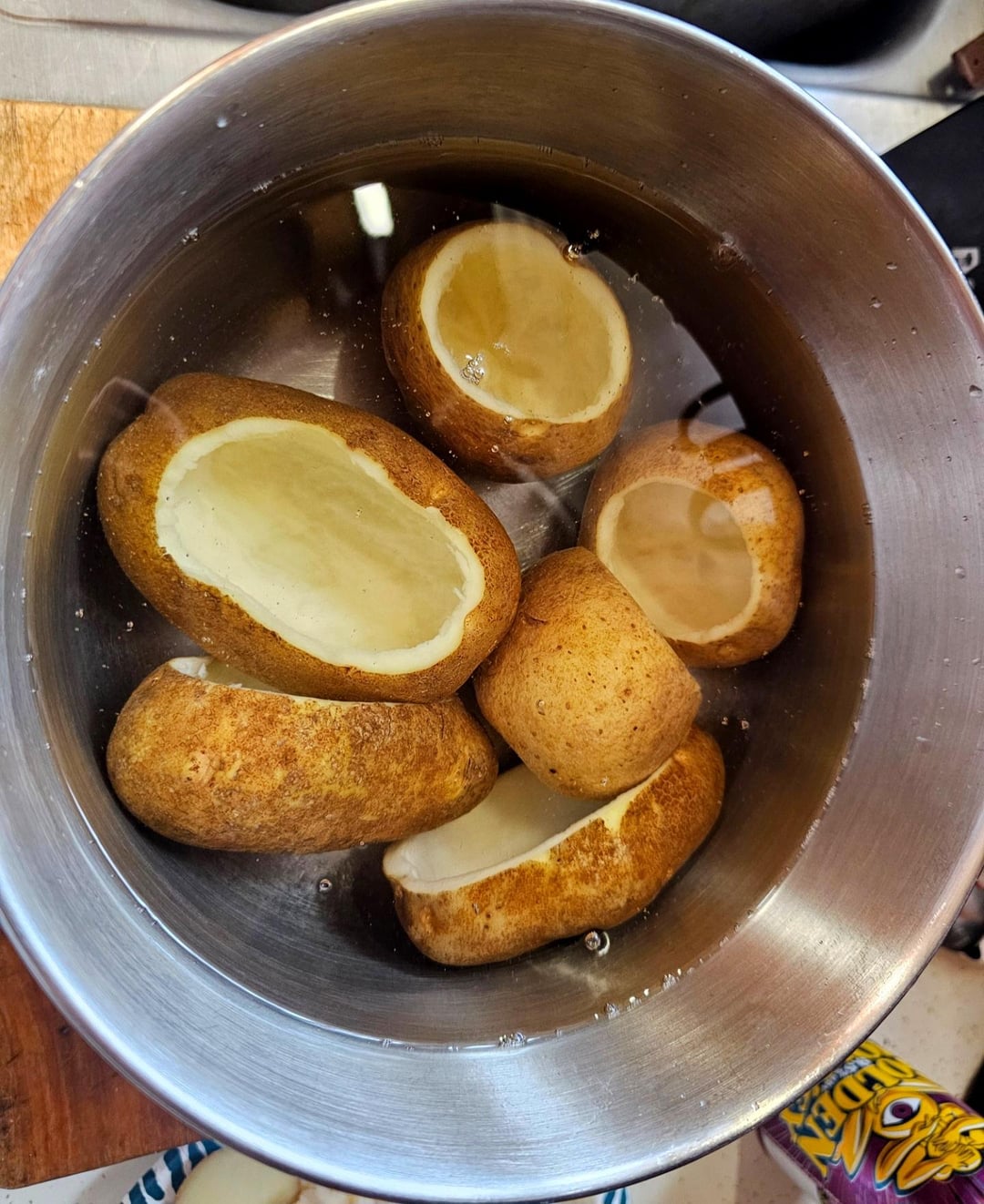 While it simmers, play some knifey spoony to hollow out some potatoes. I don't like to waste the inside so I added a few small ones to fill with mashed potatoes. Rinse the skins until the water runs clear then soak in cold water while prepping.