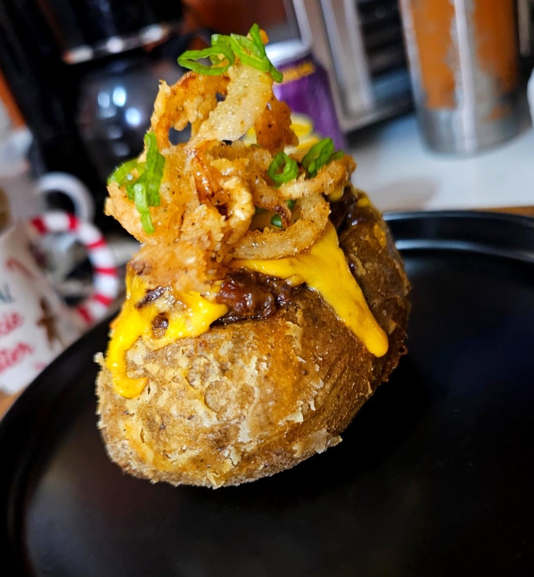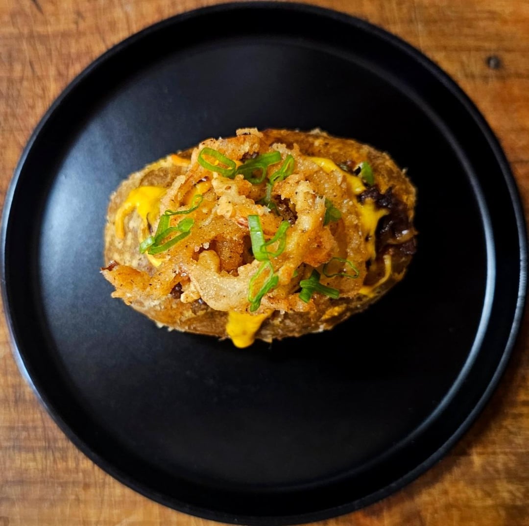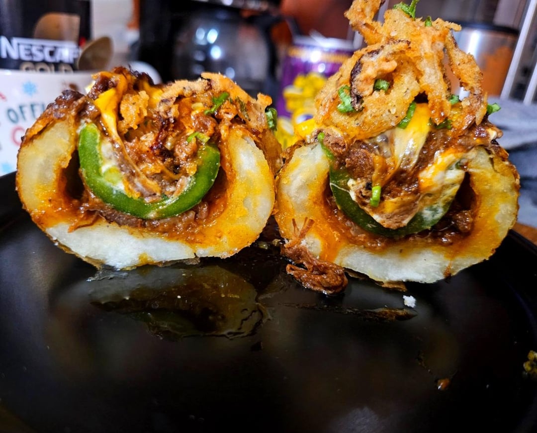 The popper filling is cream cheese & cheddar, birria on bottom, popper, more birria, cheddar, and into the oven until the cheese melts, then top w/ crispy onions & enjoy! 😁