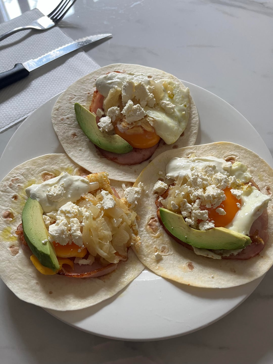 Featuring bacon, egg, avocado, crumbled feta, homemade caramelised onion, and a homemade lime crema.They were as delicious as they look. by SerSpud Dining and Cooking