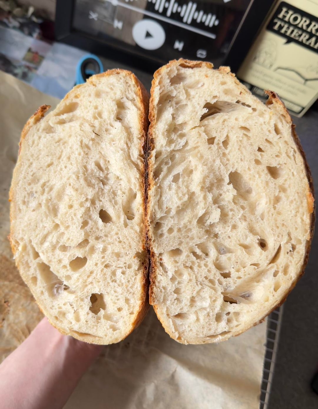 First ever bread loaf of any kind! Starter took quite a while to stabilize, ~1.5 months (my house is pretty chilly- I live in the Midwest, was also not consistent with feeds at times and had to fridge starter twice due to life chaos), but it took off after I purchased a hot plate! May have over fermented the dough for this loaf a tad (fell asleep while bulk fermenting), but I’m happy with results! I have 2 starters- one that is fed via scale (my “control” starter), and one that I’m eyeball feeding (my “experimental” starter). I’m using the eyeball fed starter experimentally as I’ve never baked anything with starter prior and wanted to do test runs for bread and other baked sourdough goods!