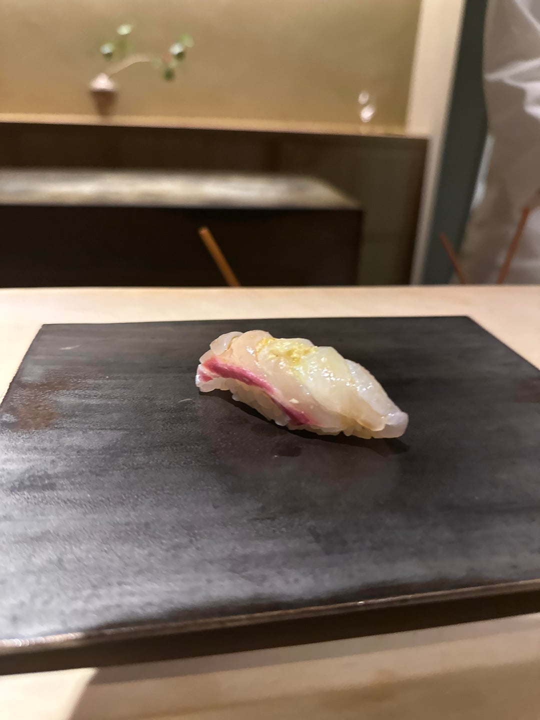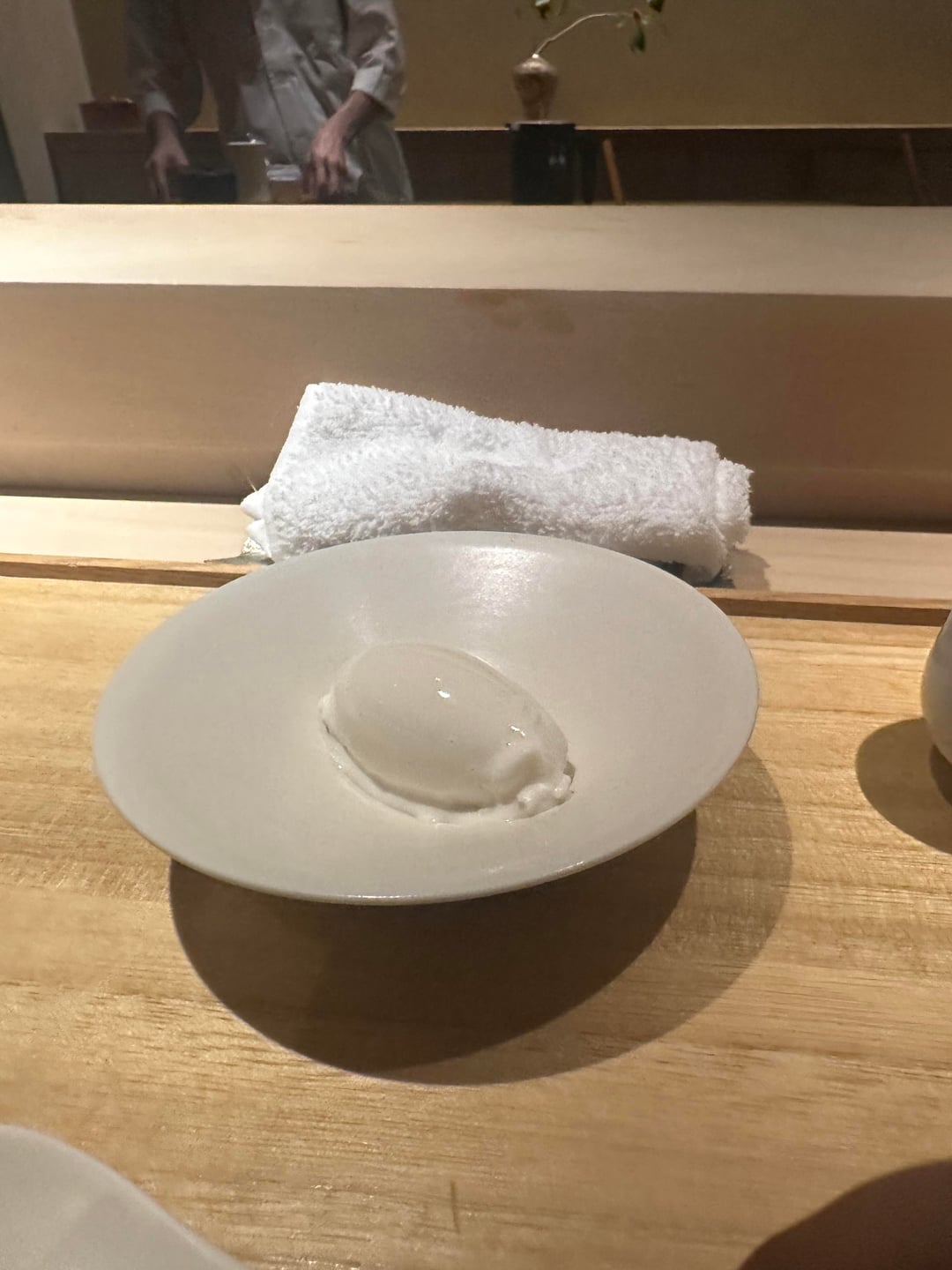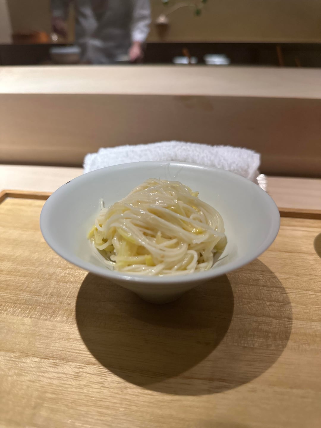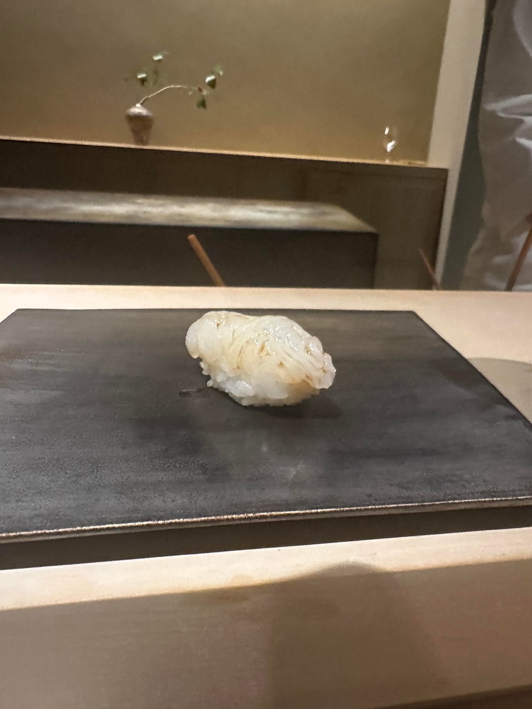 1. Shin gobo suriganashi, very nice – possibly the best surinagashi of the trip. It felt very light yet the taste was strong and there was still a solid mouthfeel 2. Mushi awabi gohan with nori, gohan cooked with awabi dashi. Excellent – nice texture from the awabi and the gohan n nori combo was excellent. I wanted more of this but they didn’t have any 🙁 3. Nagashi somen wit white asparagus from Kumamoto, refreshing. I’d be lying if I didn’t prefer an additional element of like a sansho oil or similar but it’d defeat the purpose of the course so that’s just my preference. 4. Yokowa double header – akami as zuke with karashi, toro as is with ponzu oroshi n salt. Superb, I honestly thought the best Meiji maguro I was gonna have was gonna be in Niigata but oddly it was not served the day I was there so this was a pretty solid contender for that. I also wanted more but alas 5. Oyaki dumpling filed with buri and daikon, topped with yakumo. Very nice – was worried but it wasn’t heavy or overly oily at all. I wanted another if this but nothing doing I’m afraid 6. Kue in a garlic and cabbage sauce, excellent they paired wonderfully and the sauce is a lot more restrained than the description suggested. This one was my favourite and I also asked for more of this. I am going to pre order more / larger tsumami when I come back 7. Nigiri starts w Murasaki uni from amakusa, hot but gentle shari. Superb, the best of these I had on this trip 8. Aori ika, insane texture and touch of sudachi was brilliant. This was up there with the Kitajima one. Despite the use of citrus, I felt the aori ika already had a fairly clean taste and the citrus was more additive than trying to cover up anything 9. Madai, alright but I think the funakoshi vers was a better example of local/kyushu specimens of these bream type fish in the area 10. Zuke Shima aji, nice texture – sweet oddly, not a huge fan of that 11. Akami zuke, shari still warm but a little more vinegar? Functionally very similar 12. During this tuna section they refreshed the rice a LOT like almost every 1-2 nigiri 13. Toro, Shari’s nebari went up a lot but little change besides. Solid but preferred the funakoshi version 14. Ma-aji with yuzu kosho + negi, honestly worked really nicely but I’m a sucker for all solid aji 15. Kuruma ebi kannonbiraki, alright. On vibes / marketing, this is a very famous piece here but I wasn’t super into the version I had today 16. Tachiuo nigiri, huge neta and the kawa was delicious as was the first chew of the nigiri but the mid palate and finish was kinda flat / less interesting to me 17. Negitoro temaki, very good. Loved the nori 18. Wasabon ice cream, fucking sick. Made me alright with missing ChiUnE (only half kidding). Very good ice cream