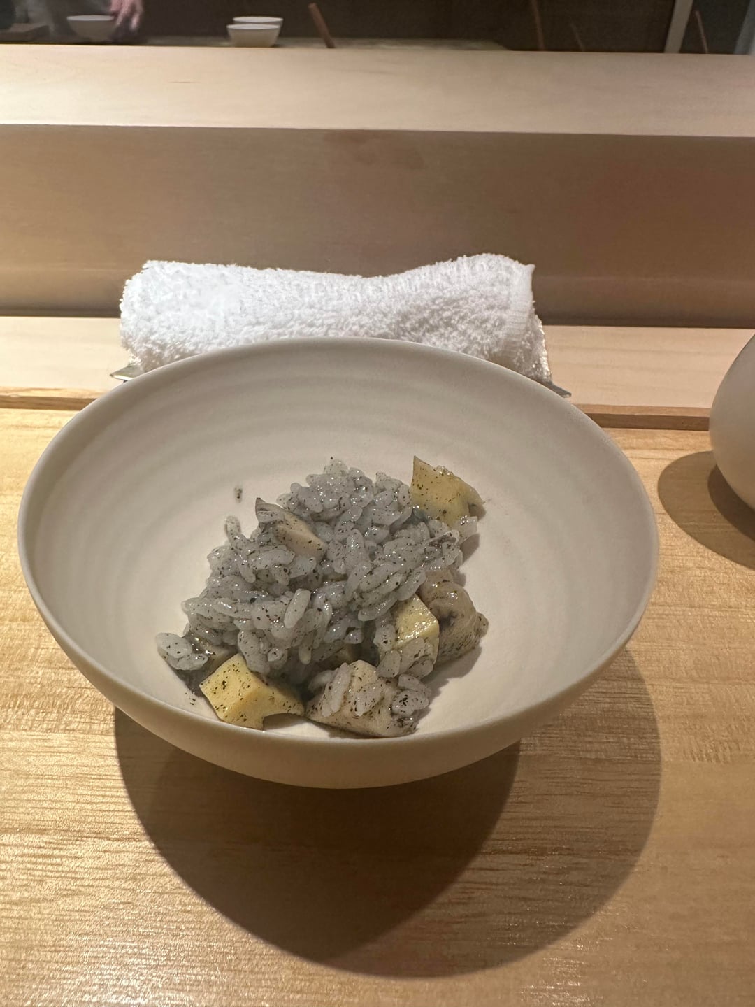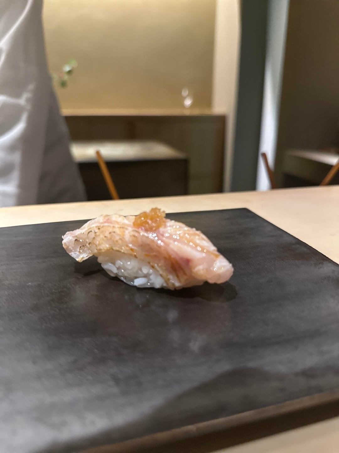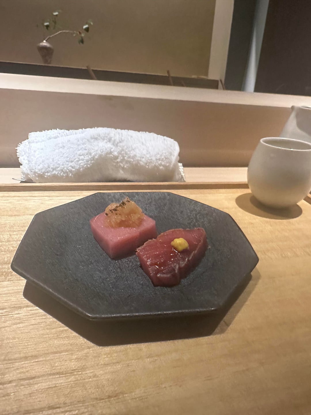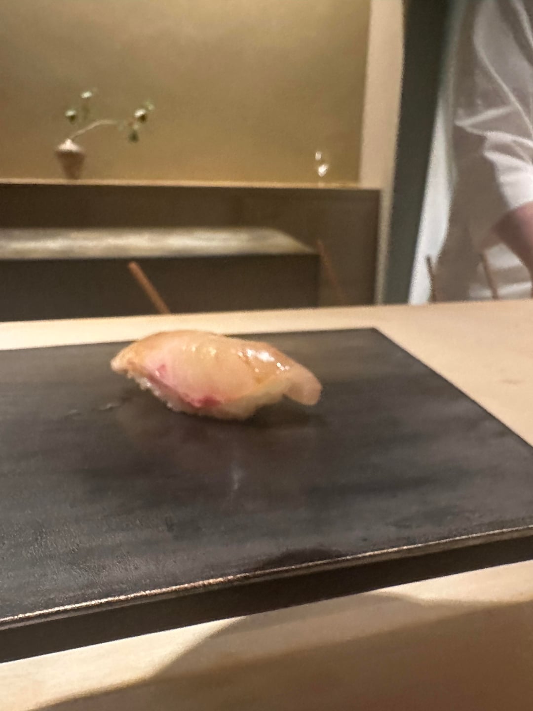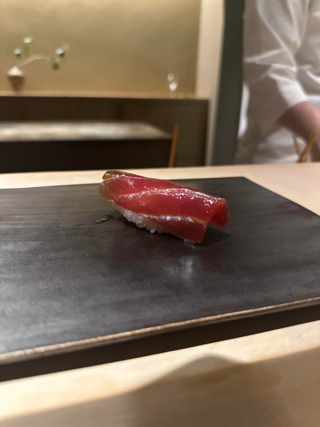1. Shin gobo suriganashi, very nice – possibly the best surinagashi of the trip. It felt very light yet the taste was strong and there was still a solid mouthfeel 2. Mushi awabi gohan with nori, gohan cooked with awabi dashi. Excellent – nice texture from the awabi and the gohan n nori combo was excellent. I wanted more of this but they didn’t have any 🙁 3. Nagashi somen wit white asparagus from Kumamoto, refreshing. I’d be lying if I didn’t prefer an additional element of like a sansho oil or similar but it’d defeat the purpose of the course so that’s just my preference. 4. Yokowa double header – akami as zuke with karashi, toro as is with ponzu oroshi n salt. Superb, I honestly thought the best Meiji maguro I was gonna have was gonna be in Niigata but oddly it was not served the day I was there so this was a pretty solid contender for that. I also wanted more but alas 5. Oyaki dumpling filed with buri and daikon, topped with yakumo. Very nice – was worried but it wasn’t heavy or overly oily at all. I wanted another if this but nothing doing I’m afraid 6. Kue in a garlic and cabbage sauce, excellent they paired wonderfully and the sauce is a lot more restrained than the description suggested. This one was my favourite and I also asked for more of this. I am going to pre order more / larger tsumami when I come back 7. Nigiri starts w Murasaki uni from amakusa, hot but gentle shari. Superb, the best of these I had on this trip 8. Aori ika, insane texture and touch of sudachi was brilliant. This was up there with the Kitajima one. Despite the use of citrus, I felt the aori ika already had a fairly clean taste and the citrus was more additive than trying to cover up anything 9. Madai, alright but I think the funakoshi vers was a better example of local/kyushu specimens of these bream type fish in the area 10. Zuke Shima aji, nice texture – sweet oddly, not a huge fan of that 11. Akami zuke, shari still warm but a little more vinegar? Functionally very similar 12. During this tuna section they refreshed the rice a LOT like almost every 1-2 nigiri 13. Toro, Shari’s nebari went up a lot but little change besides. Solid but preferred the funakoshi version 14. Ma-aji with yuzu kosho + negi, honestly worked really nicely but I’m a sucker for all solid aji 15. Kuruma ebi kannonbiraki, alright. On vibes / marketing, this is a very famous piece here but I wasn’t super into the version I had today 16. Tachiuo nigiri, huge neta and the kawa was delicious as was the first chew of the nigiri but the mid palate and finish was kinda flat / less interesting to me 17. Negitoro temaki, very good. Loved the nori 18. Wasabon ice cream, fucking sick. Made me alright with missing ChiUnE (only half kidding). Very good ice cream